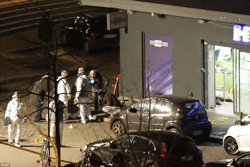 Một nạn nhân xấu số nằm ở phía gần cửa ra vào. Cảnh sát bảo vệ hiện trường.
