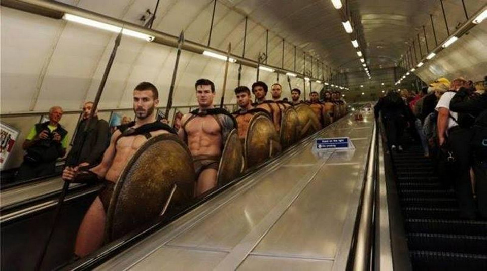 Một nhóm các chàng trai quyết định khoác lên mình bộ quần áo như người lính Spartan từ bộ phim 300 và gây ngạc nhiên cho tất cả mọi người khi xuất hiện tại hệ thống tàu điện ngầm ở London.