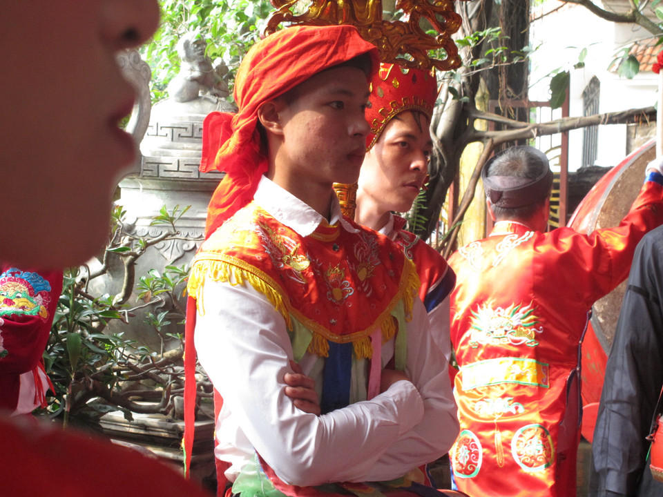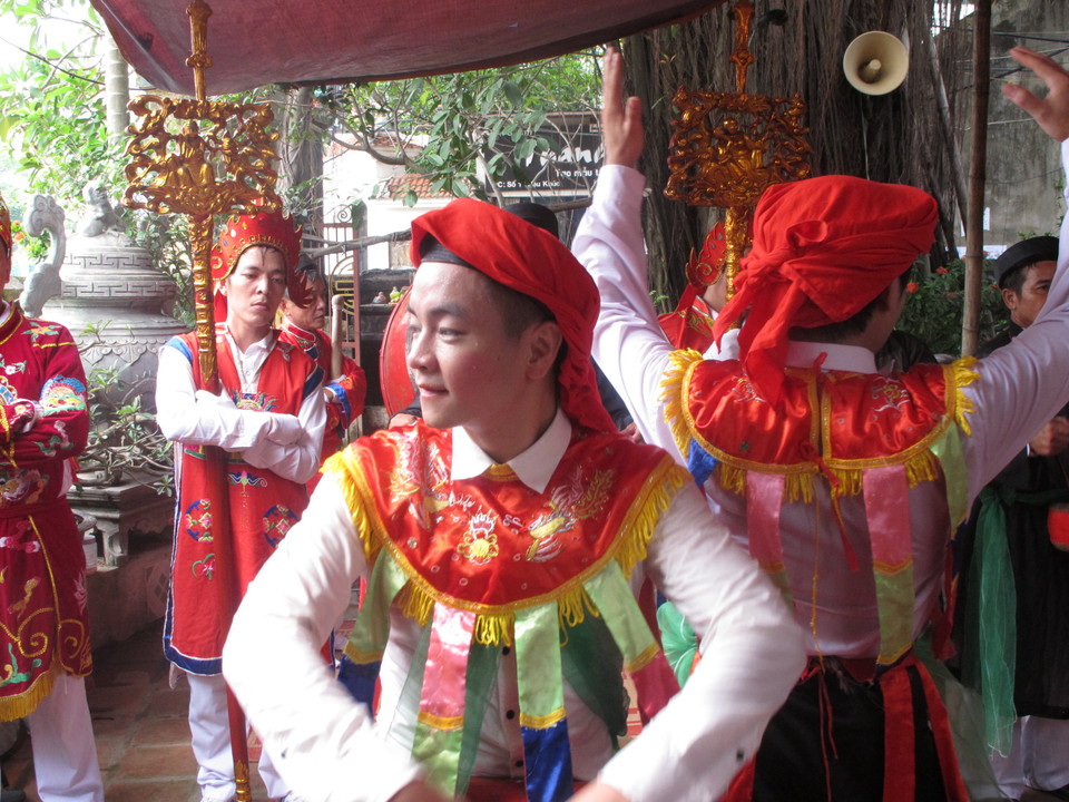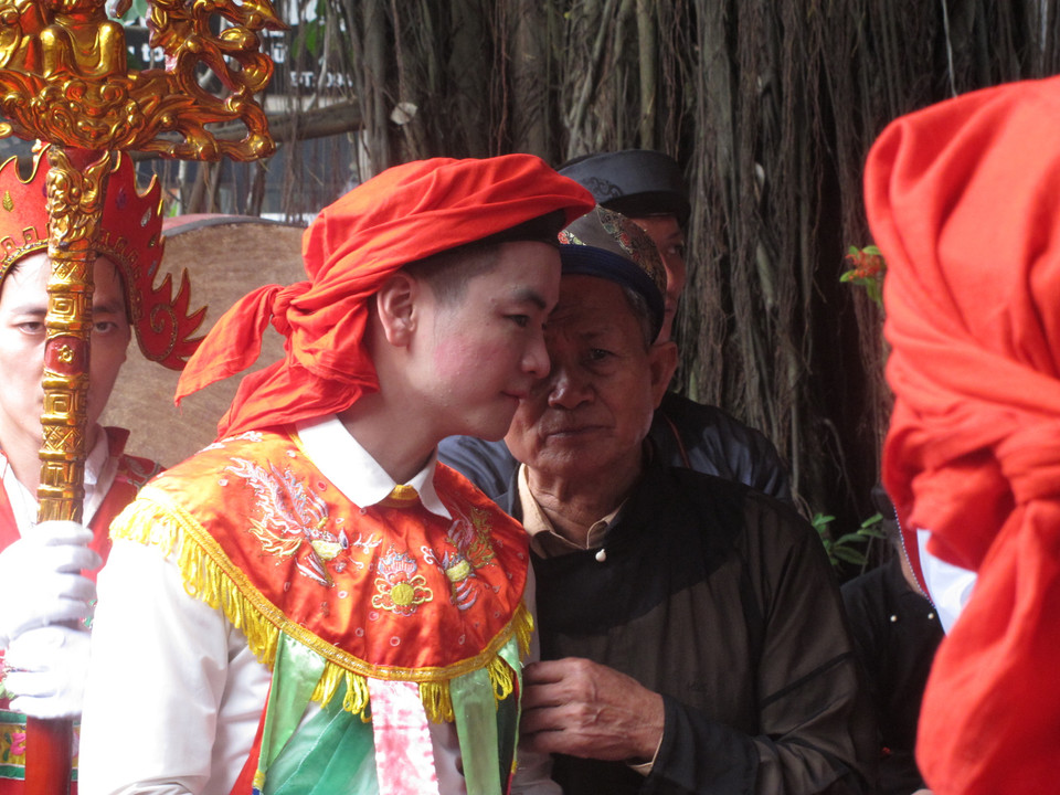 Những người tới xem chắc hẳn sẽ không khỏi bất ngờ khi chứng kiến những chàng trai đánh phấn bôi son, mặc áo mớ ba mớ bảy múa ở sân đình. Chẳng những thế, họ còn còn liếc mắt đưa tình, trao cho nhau những cử chỉ tình tứ không khác gì những cô gái thực thụ. (Ảnh: Tiến Đạt/Vietnam+)