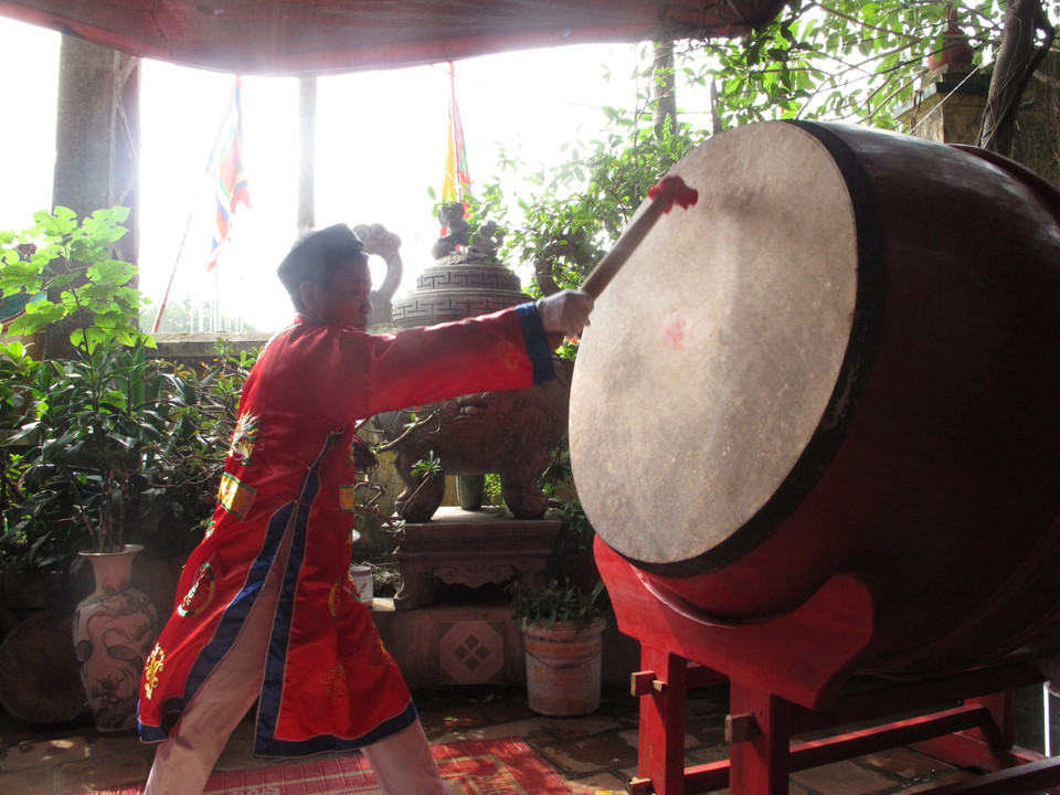 Bên cạnh các nghi lễ truyền thống như lễ khai ấn, lễ khai hội dâng hương tưởng niệm ngày mất của Anh hùng dân tộc Trần Hưng Đạo, thì trong phần hội, làng Triều Khúc còn mang tới điệu múa 'đặc sản' của ngôi làng này đó là điệu 'con đĩ đánh bồng.' (Ảnh: Tiến Đạt/Vietnam+)