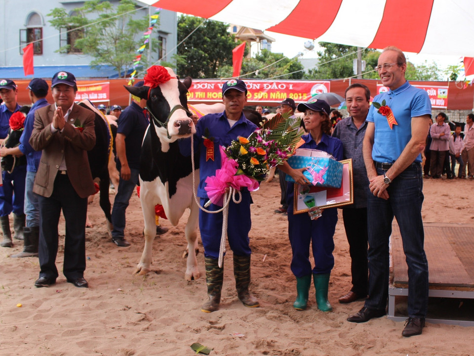 'Hoa hậu bò sữa' năm 2015 sinh ra từ năm 2010, có bố từ Mỹ, mẹ từ Hà Lan-Cuba, trọng lượng 710 kg, đã đẻ 3 lứa. Sản lượng sữa mỗi ngày trung bình 59,6 kg/ngày. (Ảnh: Hùng Võ/Vietnam+)
