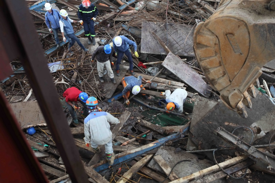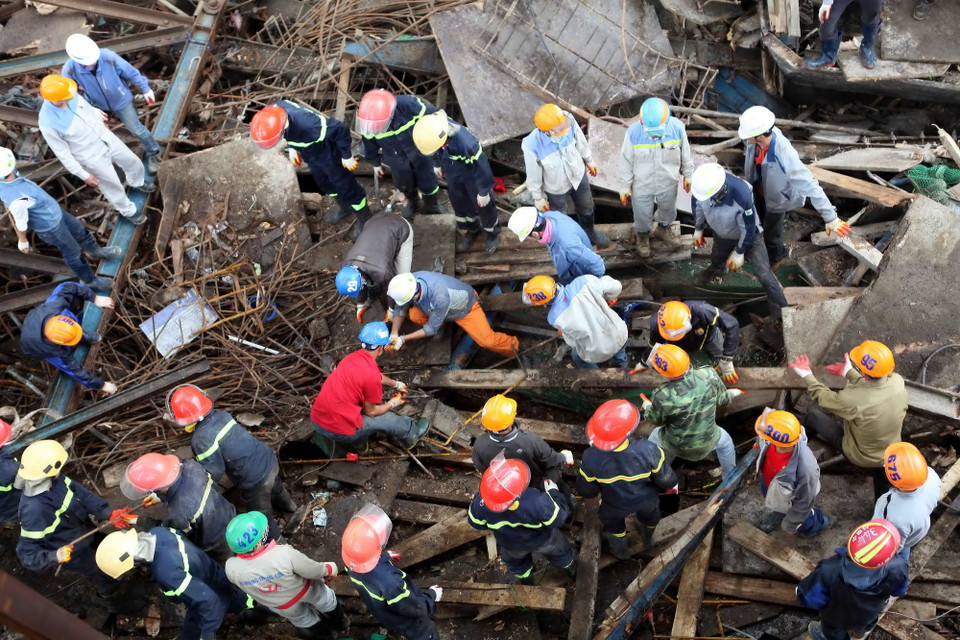 Huy động lực lượng nhanh chóng khắc phục hậu quả, tìm kiếm, cứu hộ các nạn nhân còn mắc kẹt. (Ảnh: Thanh Tùng/TTXVN)
