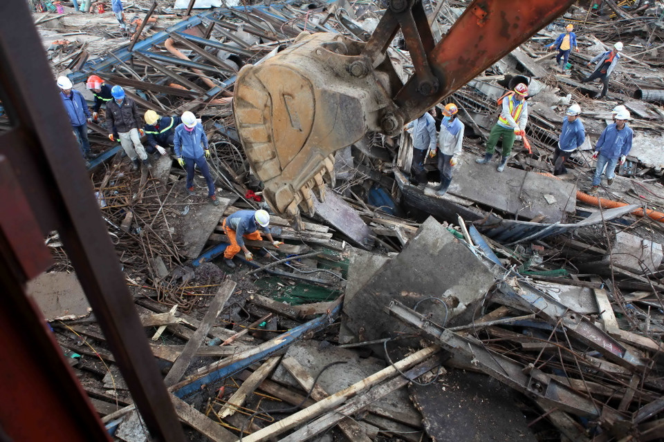 Các công nhân trên công trường cũng được huy động tham gia hoạt động cứu hộ. (Ảnh: Thanh Tùng/TTXVN)