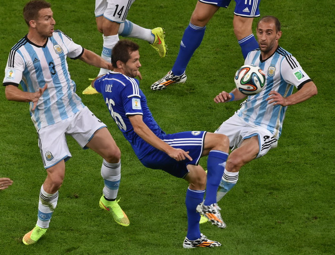 08/07/2014 16:20 Khi toàn đội đang họp bàn chiến thuật, tiền đạo Ezequiel Lavezzi đã nhại lại pha ngả người suýt ngã của Sabella ở trong trận đấu với Bỉ.
