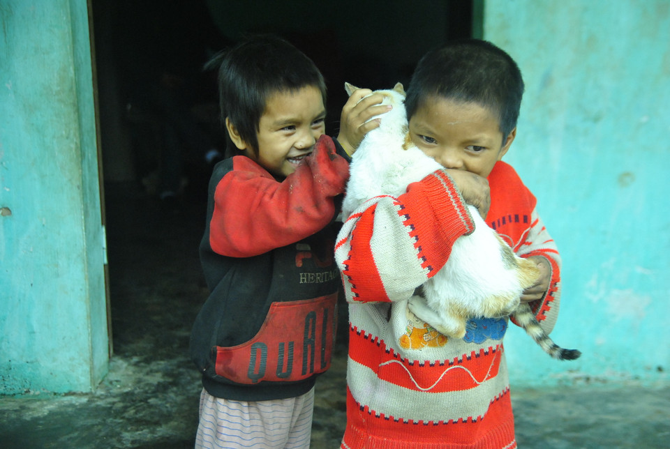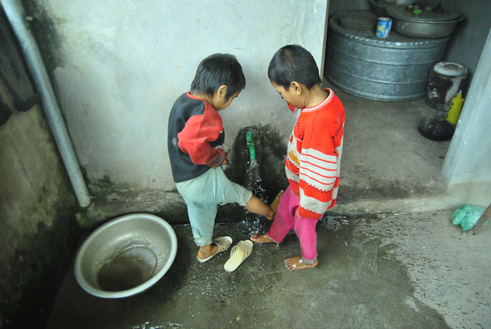 Bé Tư (7 tuổi, áo đỏ) và bé Năm (5 tuổi, áo đen) thường cả ngày chỉ quấn lấy nhau. Tuy đôi lúc nghịch phá, nhưng vẫn nghe lời bà.