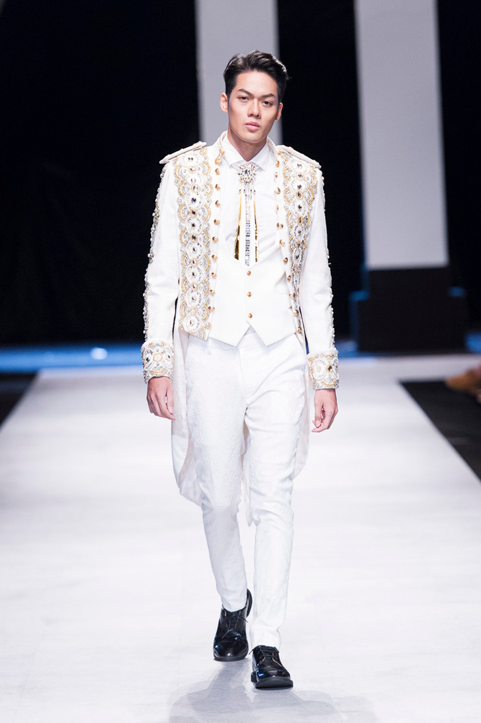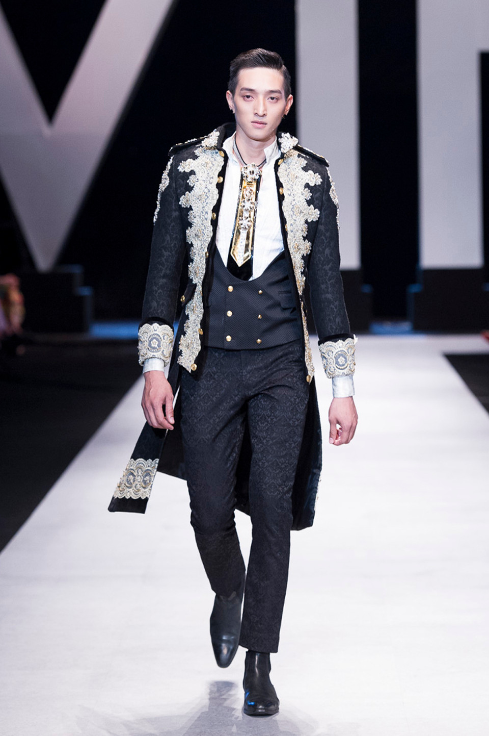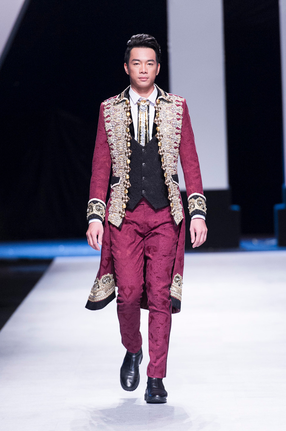 Lấy cảm hứng từ những bộ lễ phục cổ điển của Pháp thời Louis thứ 18, cùng hình tượng hoàng tử, công chúa, nhà thiết kế Lê Long Dũng đã biến tấu, thổi làn gió mới vào các bộ lễ phục nam đuôi tôm (2 đuôi, 4 đuôi, 6 đuôi) đầy lịch lãm và sang trọng. (Ảnh: BTC)