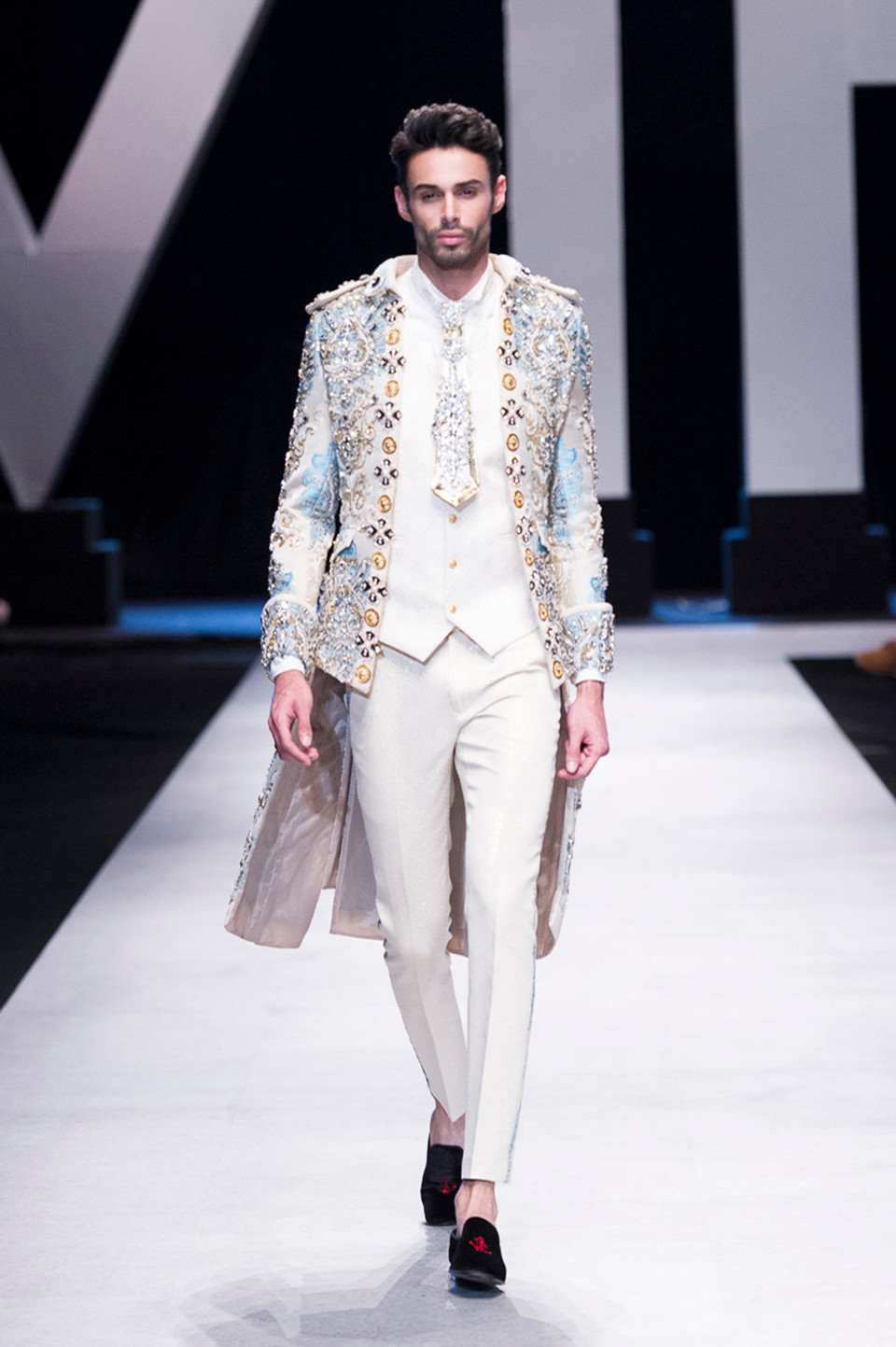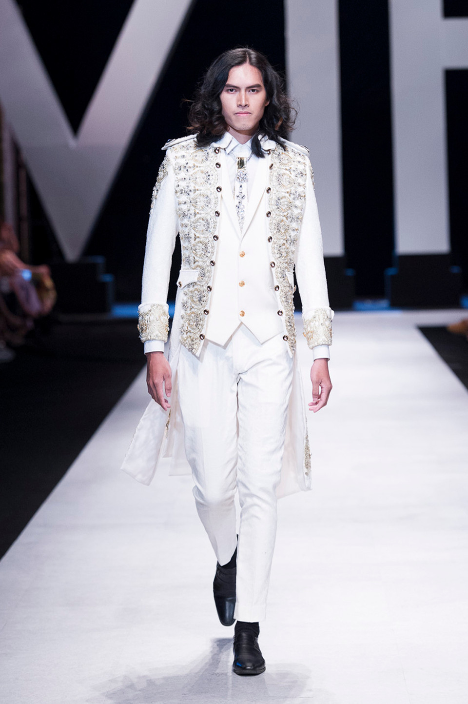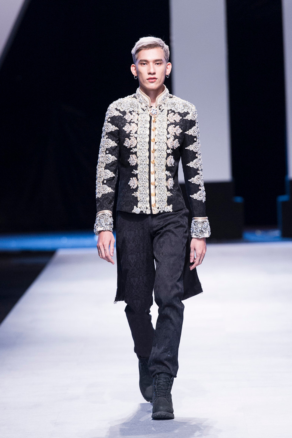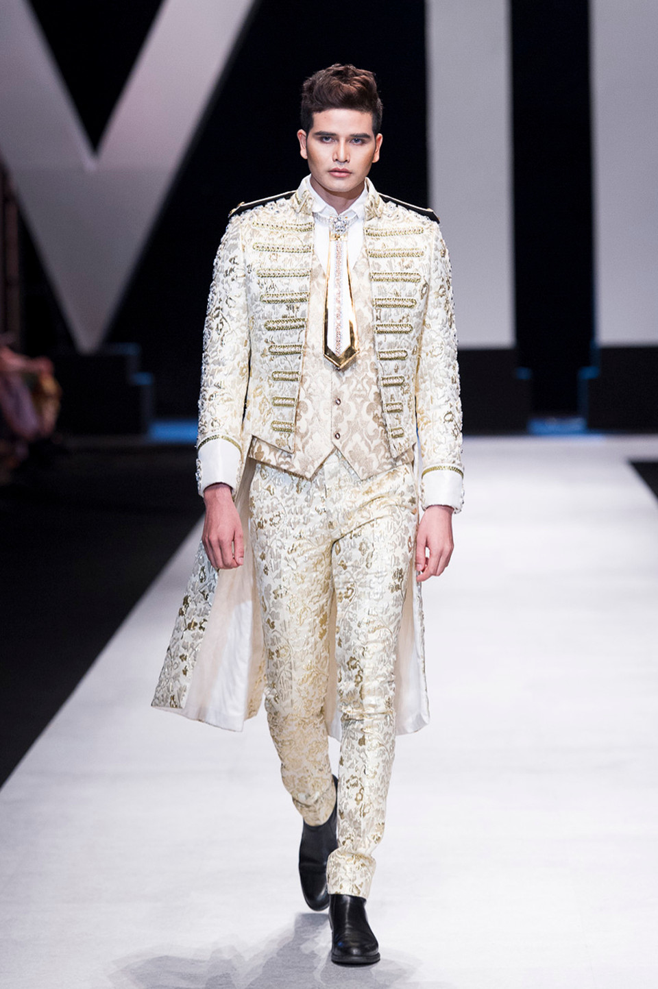 Lấy cảm hứng từ những bộ lễ phục cổ điển của Pháp thời Louis thứ 18, cùng hình tượng hoàng tử, công chúa, nhà thiết kế Lê Long Dũng đã biến tấu, thổi làn gió mới vào các bộ lễ phục nam đuôi tôm (2 đuôi, 4 đuôi, 6 đuôi) đầy lịch lãm và sang trọng. (Ảnh: BTC)