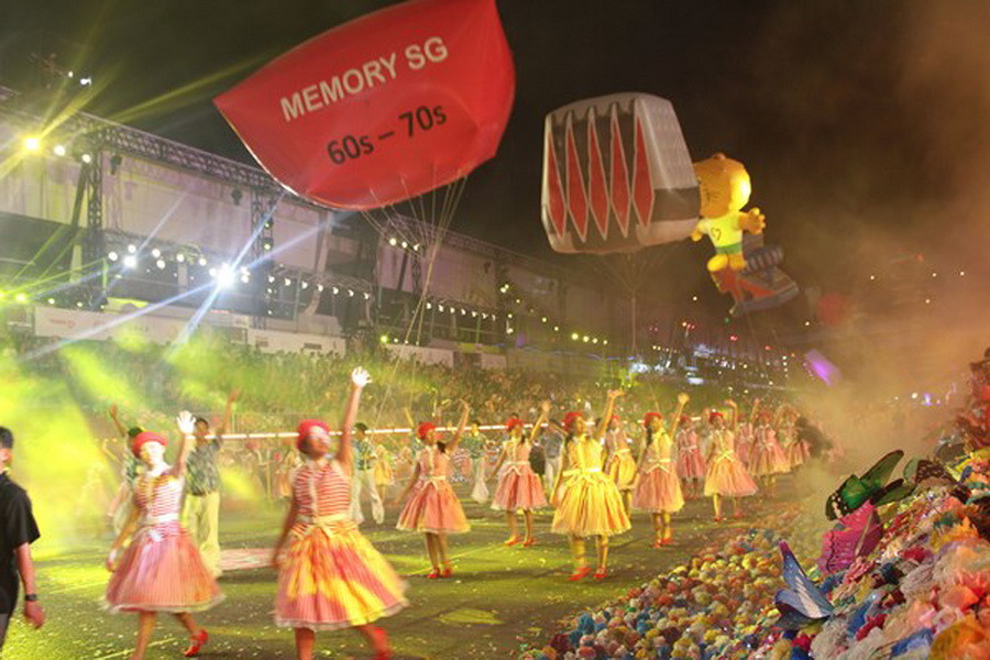 Tiếp theo là các đoàn nghệ sỹ trong nước với những tiết mục hát múa mang đậm bản sắc của Đảo quốc Sư tử với những biểu ngữ, khẩu hiệu chào mừng 50 Quốc khánh Singapore. (Ảnh: Việt Hải-Mỹ Bình-Văn Hải/Vietnam+)