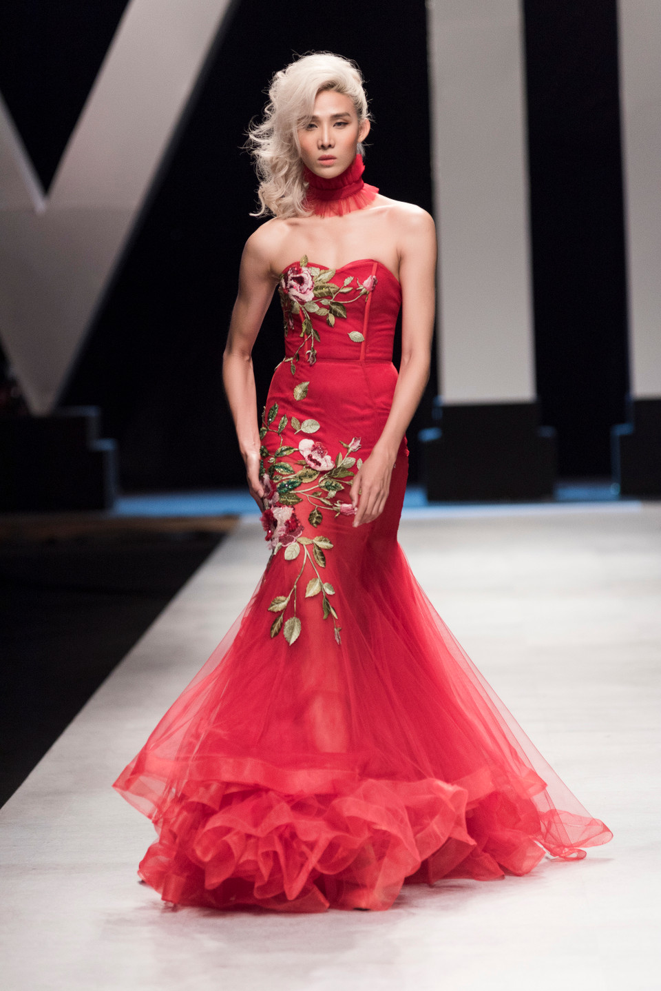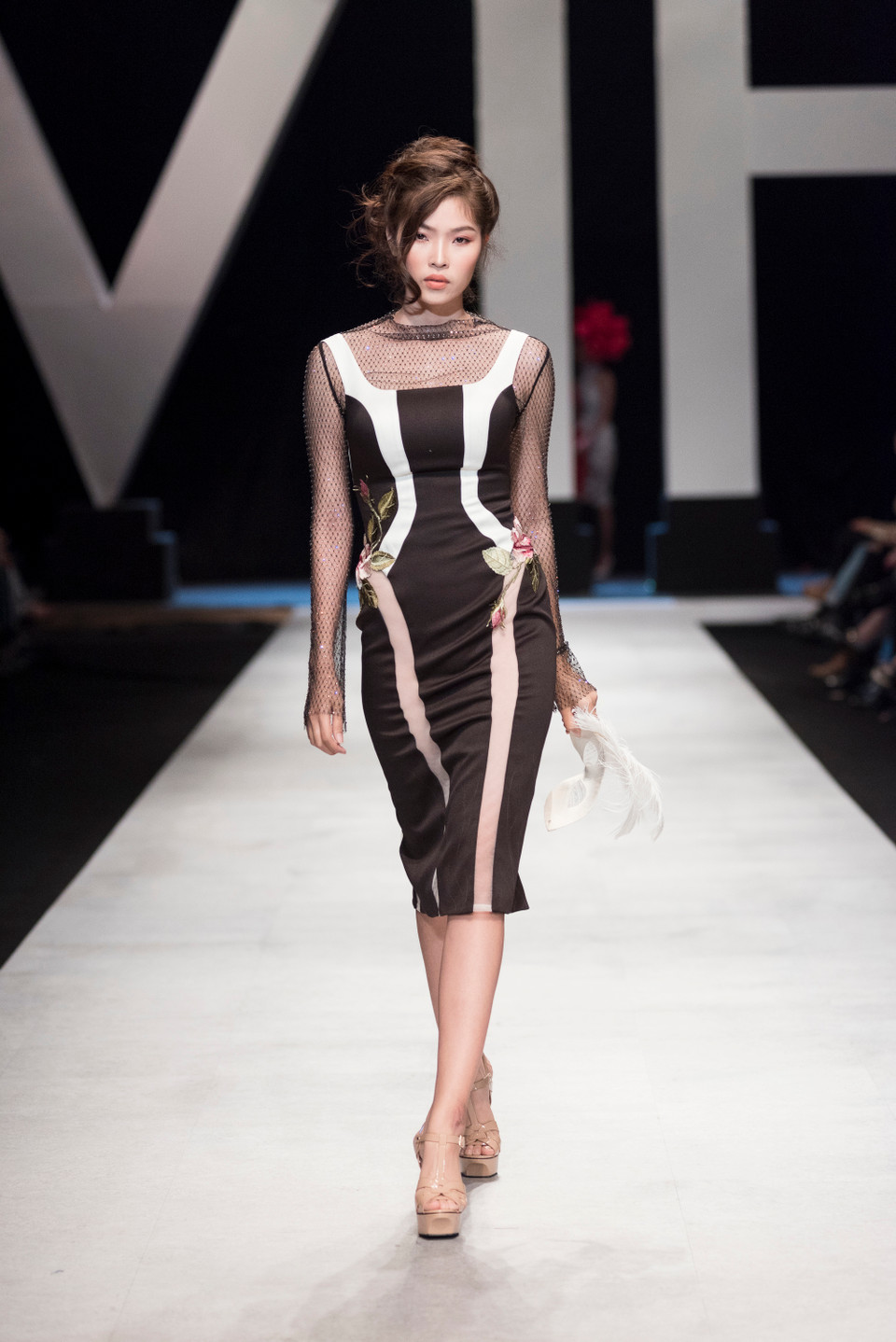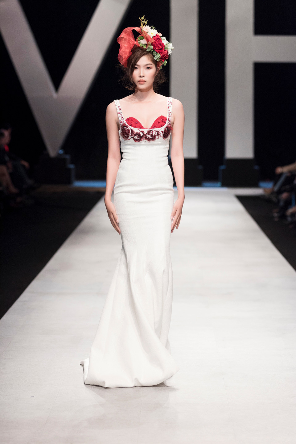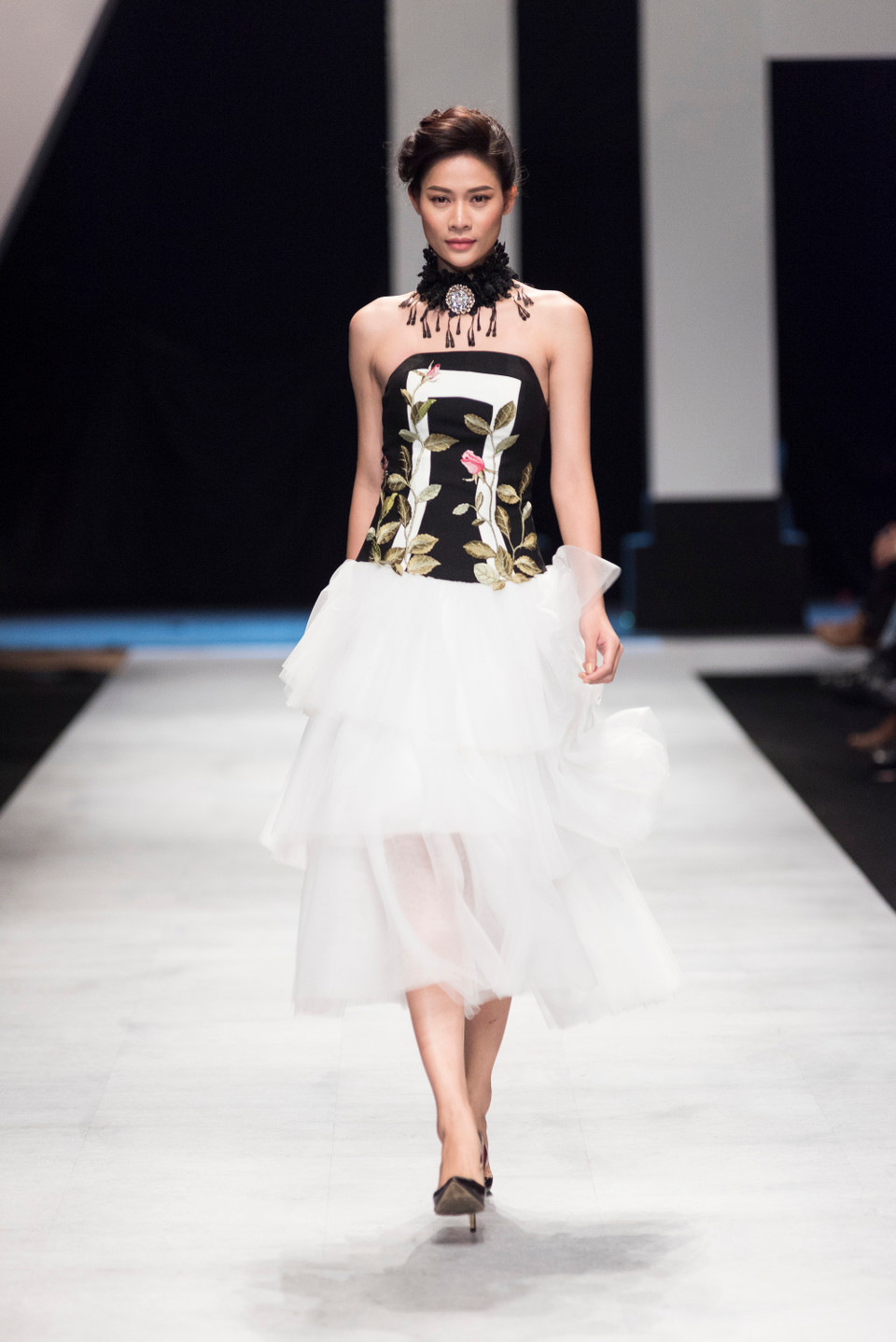 Bộ sưu tập B.F.F (Bold Fun Forever) mới nhất của nhà thiết kế Vincent Đoàn tập trung vào vẻ đối lập màu sắc cùng sự hòa trộn của ba gam màu cổ điển: trắng-đen-đỏ, điểm xuyết thêm những họa tiết hoa baroque màu pastel.