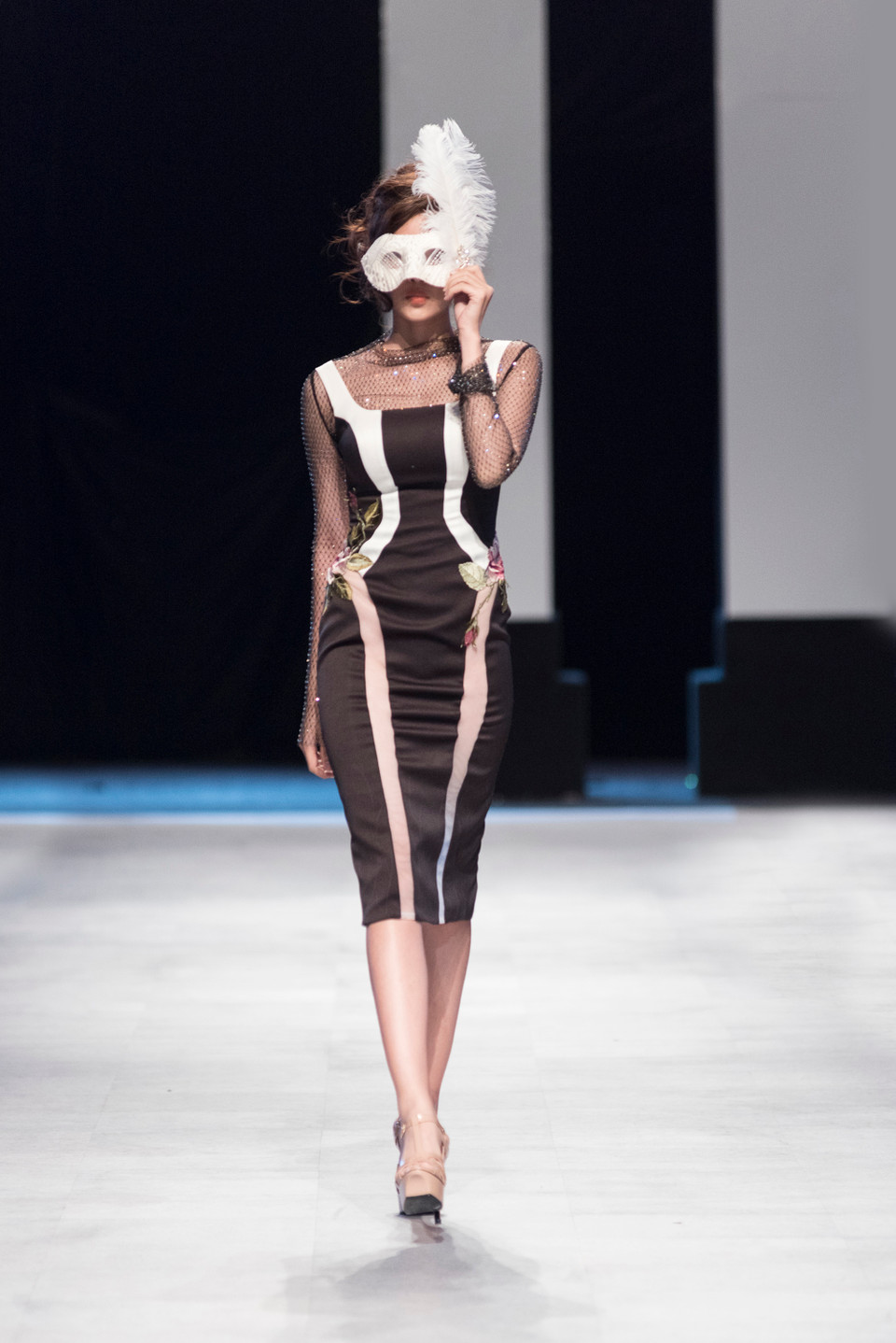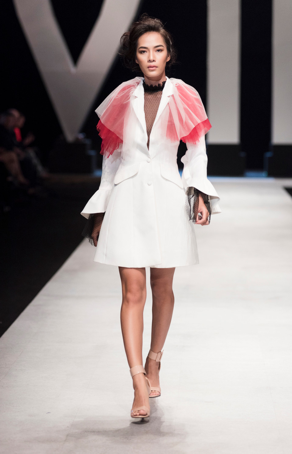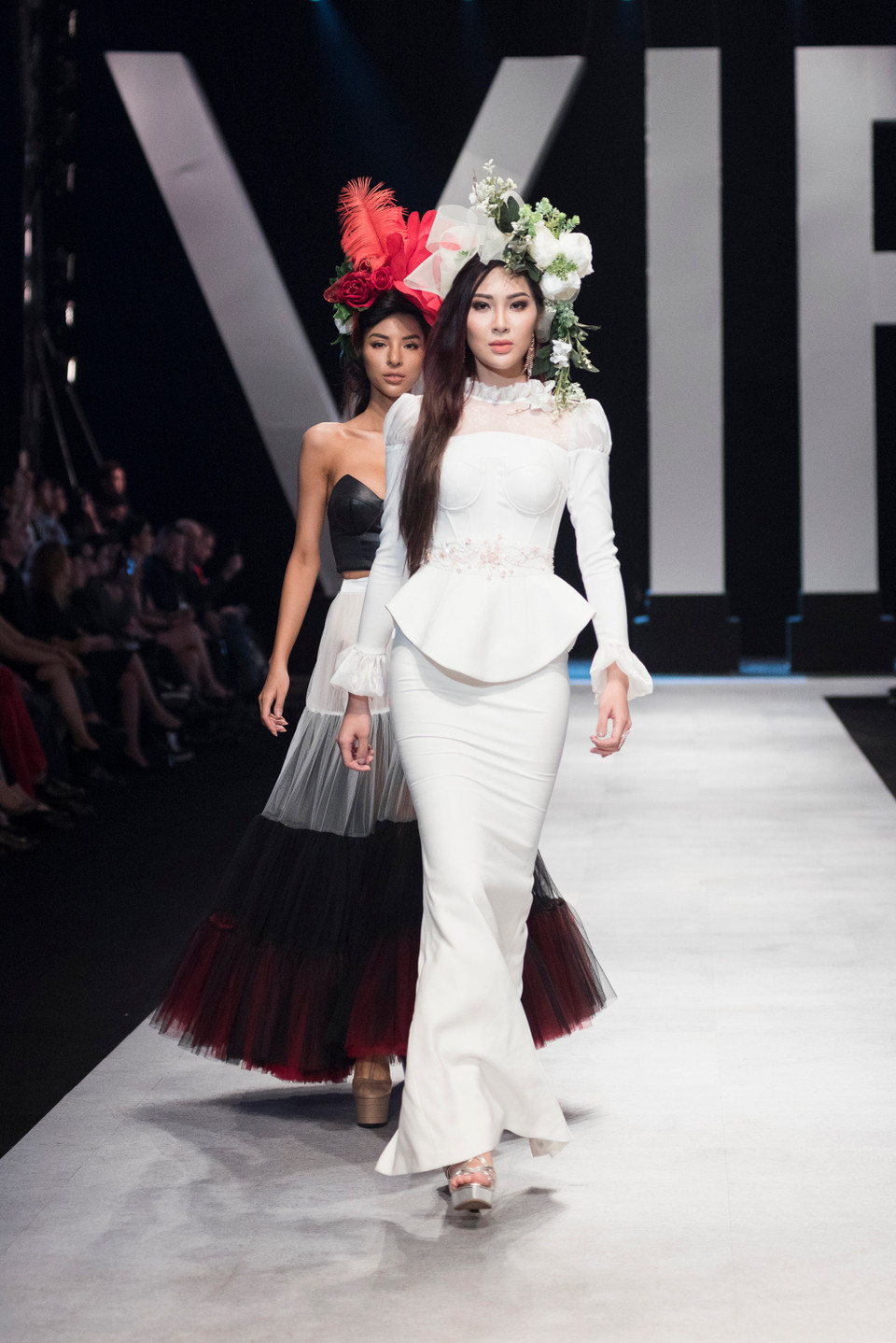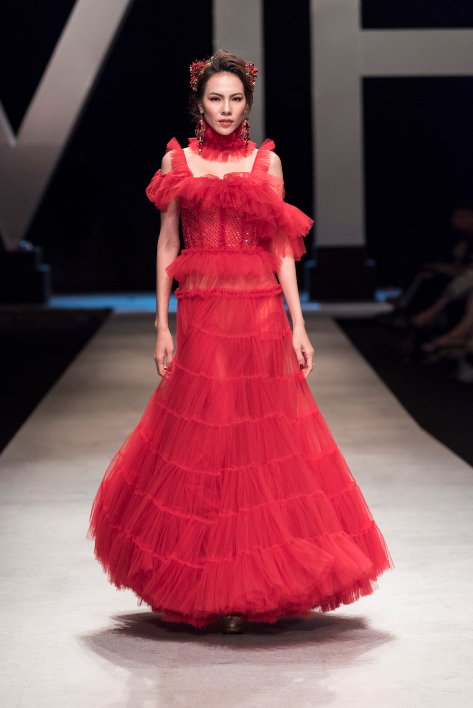 Bộ sưu tập B.F.F (Bold Fun Forever) mới nhất của nhà thiết kế Vincent Đoàn tập trung vào vẻ đối lập màu sắc cùng sự hòa trộn của ba gam màu cổ điển: trắng-đen-đỏ, điểm xuyết thêm những họa tiết hoa baroque màu pastel.