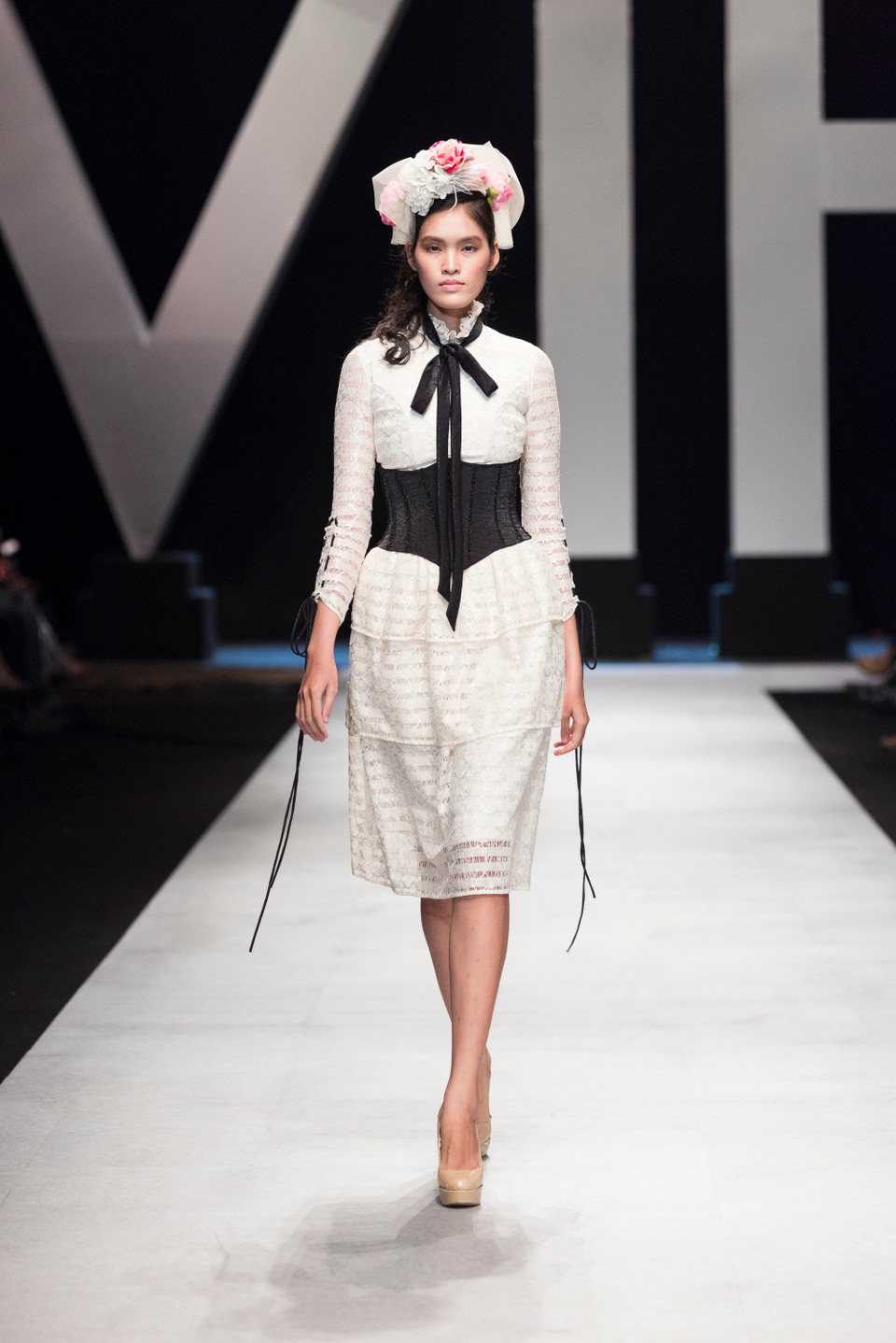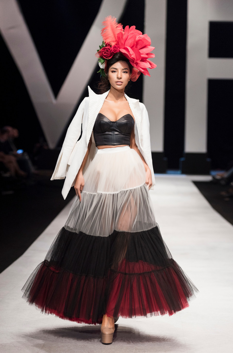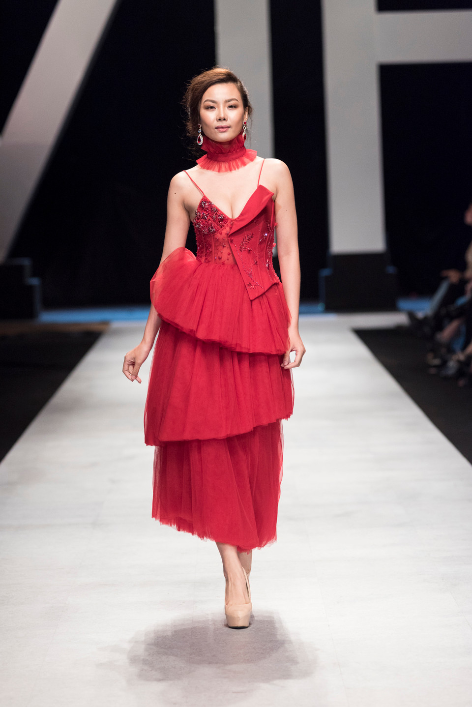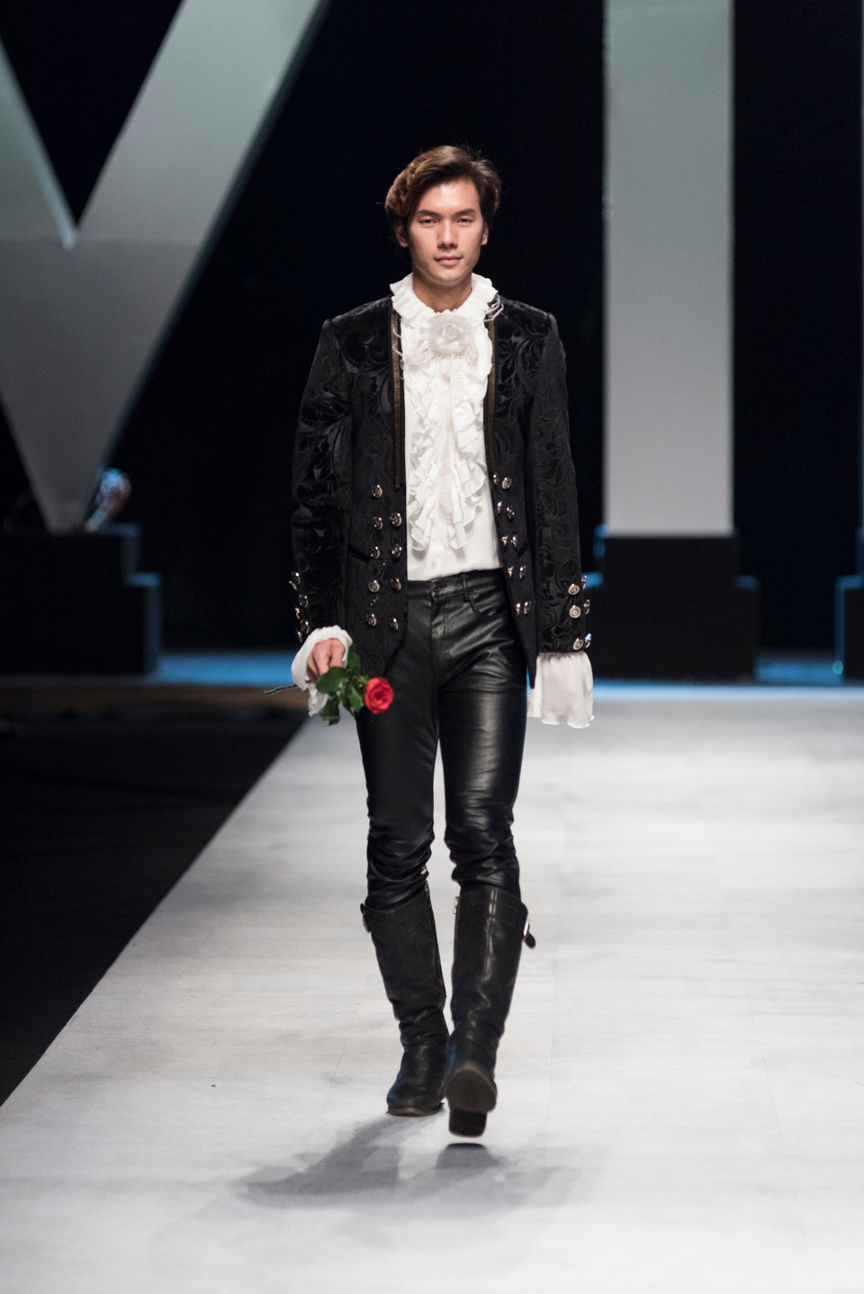 Bộ sưu tập B.F.F (Bold Fun Forever) mới nhất của nhà thiết kế Vincent Đoàn tập trung vào vẻ đối lập màu sắc cùng sự hòa trộn của ba gam màu cổ điển: trắng-đen-đỏ, điểm xuyết thêm những họa tiết hoa baroque màu pastel.