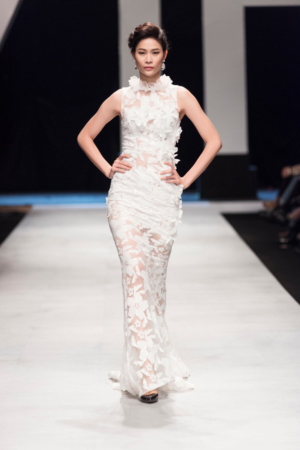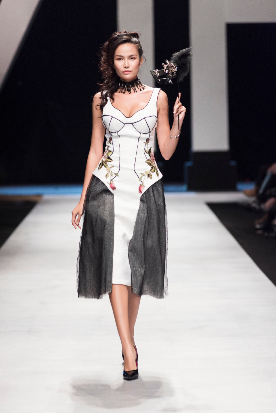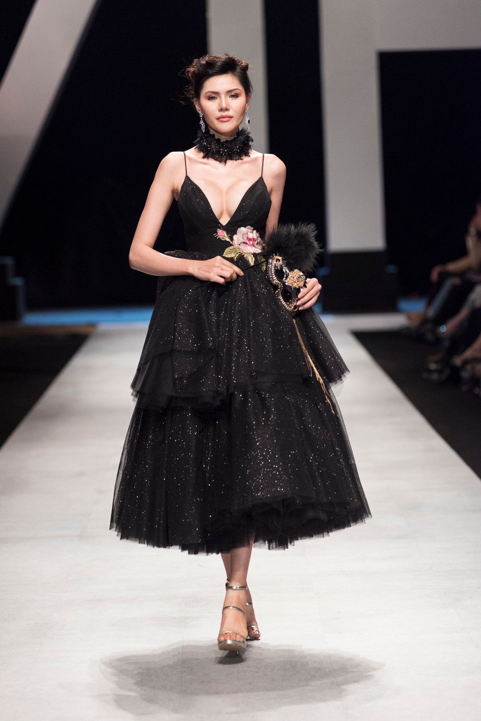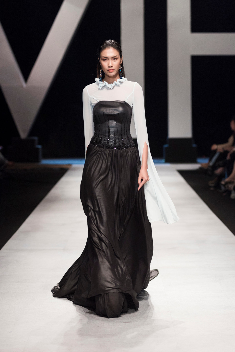 Người mẫu Phương Mai mở đầu khúc thứ hai của show diễn, không còn nhẹ nhàng, bồng bềnh như khúc dạo đầu, mà táo bạo hơn, mềm mại nhưng dứt khoát, nên thơ nhưng không uỷ mị với các đường cắt xẻ đầy chủ ý trên trang phục.