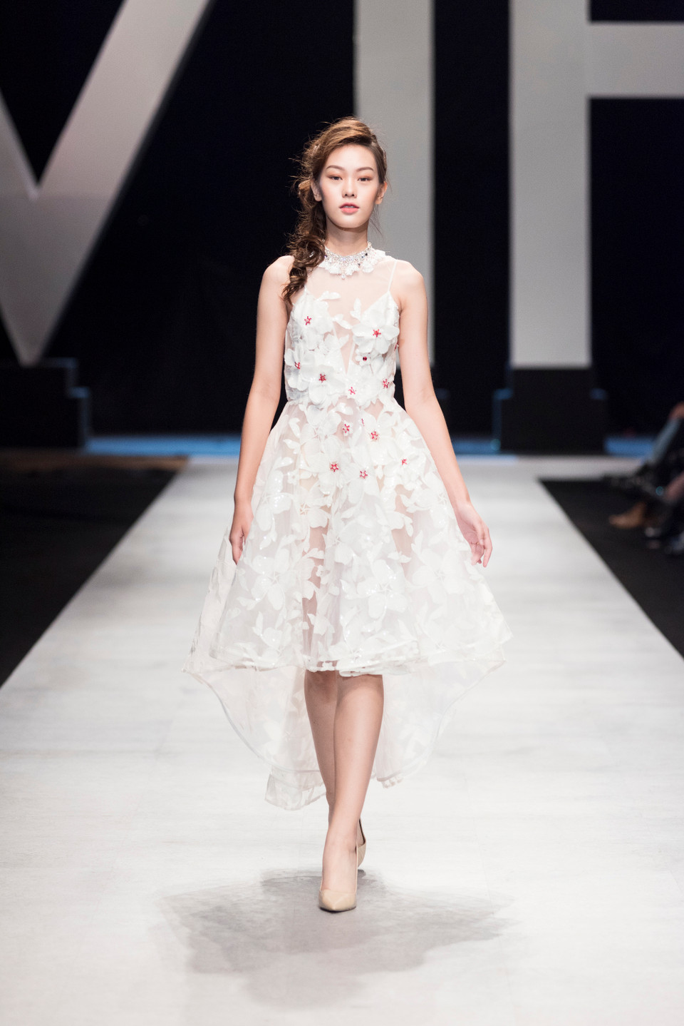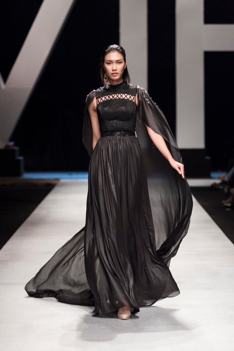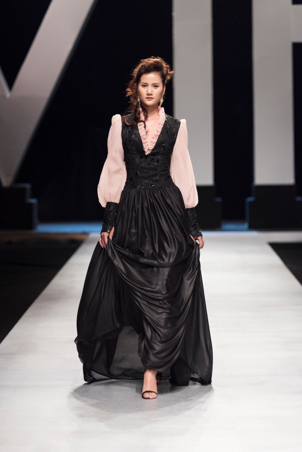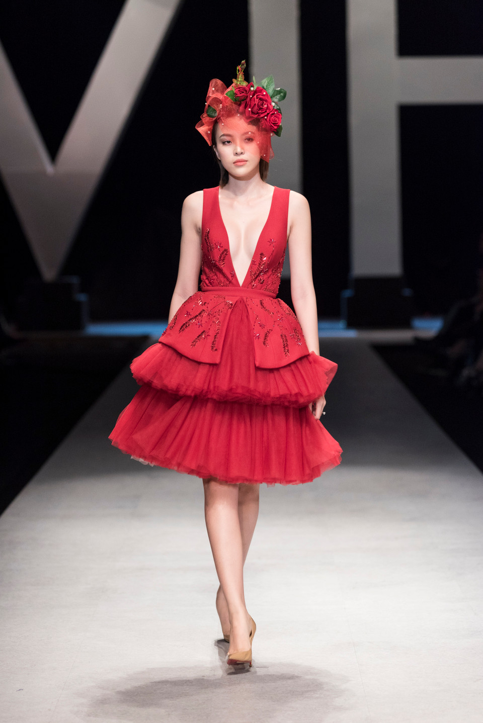 Người mẫu Phương Mai mở đầu khúc thứ hai của show diễn, không còn nhẹ nhàng, bồng bềnh như khúc dạo đầu, mà táo bạo hơn, mềm mại nhưng dứt khoát, nên thơ nhưng không uỷ mị với các đường cắt xẻ đầy chủ ý trên trang phục.