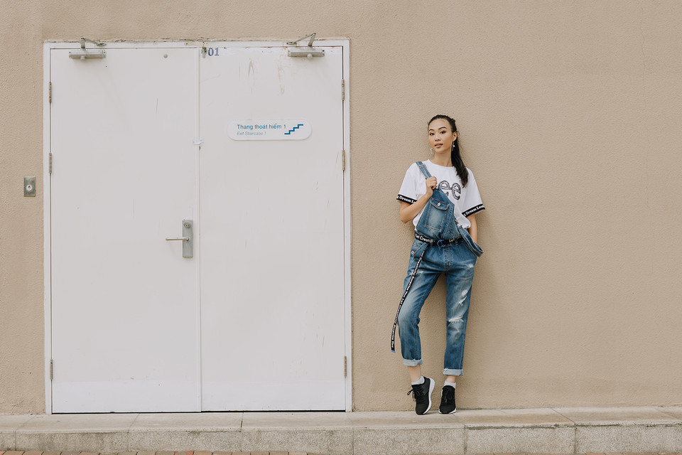 Tuyết Như hóa thân thành cô nàng có phong cách thời trang khỏe khoắn, năng động khi khéo léo diện chiếc quần yếm jean kết hợp cùng áo thun trắng đơn giản và trẻ trung, phù hợp với không khí nhộn nhịp, đô hội của Sài Gòn.