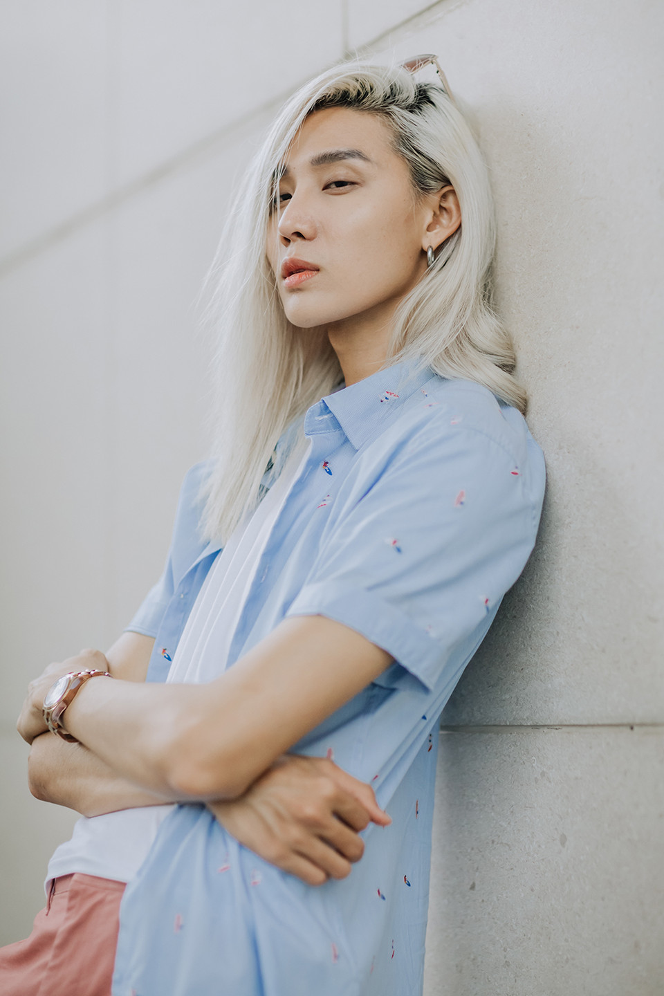 Mạc Trung Kiên khỏe khoắn trong set đồ kết hơp áo thun màu đỏ rực rỡ cùng quần jean và áo sơ mi khoác ngoài, đem đến vẻ ngoài trẻ trung và năng động.