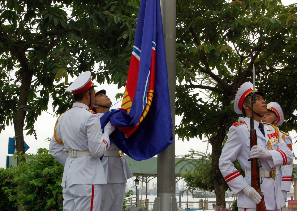 Nghi thức lễ Thượng cờ cờ ASEAN và các nước thành viên nhân kỷ niệm 20 năm Việt Nam gia nhập ASEAN và 48 năm thành lập ASEAN. (Ảnh: Thanh Vũ/TTXVN)