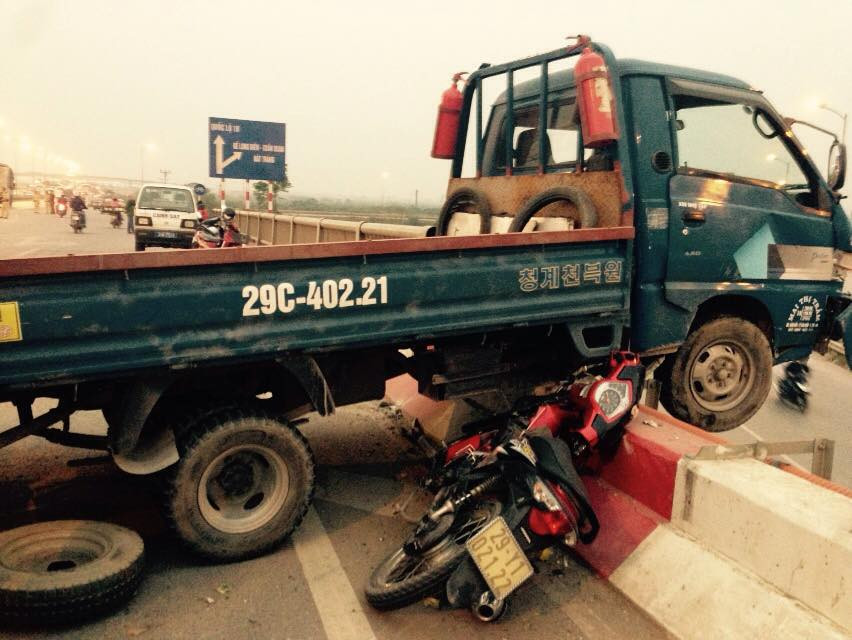 Ôtô tải mang biển số 29C-40221 đang lưu thông theo hướng Hà Nội-Quốc lộ 5 trên cầu Thanh Trì thì mất lái thì tông vào chiếc xe máy biển số 29Y1-021.22.