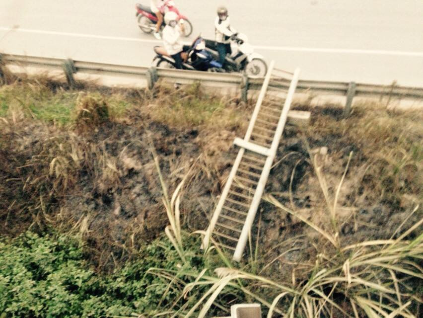 Đầu xe tải húc bay tiếp thanh thép chắn cầu, nhô hẳn ra bên ngoài. (Ảnh: Sơn Bách/Vietnam+)