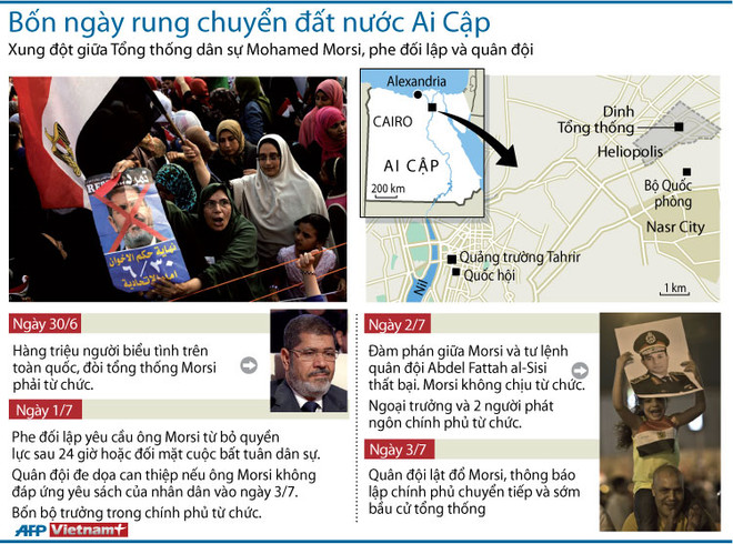 Ngày 3/7, người đứng đầu lực lượng vũ trang Ai Cập Abdel Fattah al-Sisi đãra tuyên bố đình chỉ Hiến pháp và bổ nhiệm Chánh án Tòa án Hiến pháp làm lãnhđạo lâm thời của nước này.