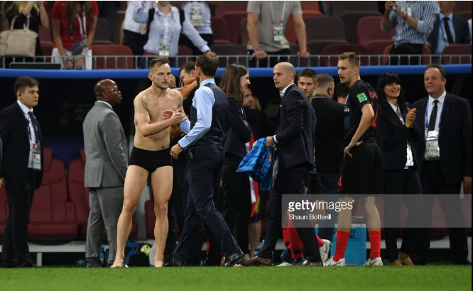 Ivan Rakitic đã không ngần ngại khi quyết định cởi quần áo ngay trên sân để ăn mừng chiến thắng lịch sử của đội tuyển Croatia trước tuyển Anh.