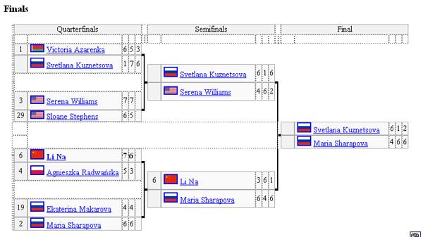 Tại vòng bán kết, Maria Sharapova đã giành chiến thắng 6-3, 4-6 và 6-1 trước Li Na,trong khi người đồng hương của cô là Kuznetsova vượt qua Serena sau 3 set với tỷsố 6-4, 1-6 và 6-2.