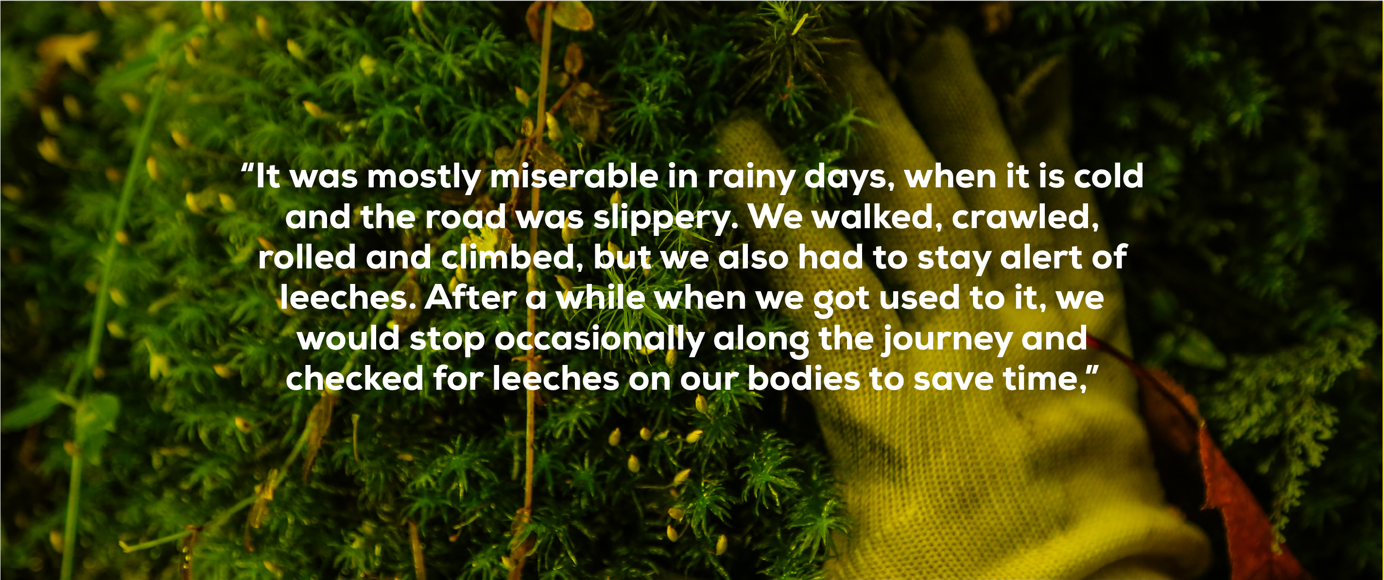 The terrain was extremely slippery. The water, which comes down from high above, has carved into the land, forming a gully along the mountainside. To us it appeared like an open wound that had not healed. The slope ahead appeared incredibly steep. The forest was dense with trees. We stood unsure of how we would progress, eventually realising, at times, the only way to move forward would be to crawl. Occasionally, as we progressed up the mountainside, we heard or saw rocks tumbling down the slope.