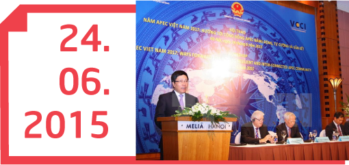 Sáng 24/6/2015, tại Hà Nội, Bộ Ngoại giao phối hợp Ban Thư ký Diễn đàn hợp tác kinh tế châu Á-Thái Bình Dương (APEC) và Phòng Thương mại và Công nghiệp Việt Nam tổ chức đã diễn ra Hội thảo “Năm APEC Việt Nam 2017: Hướng tới cộng đồng APEC năng động, tự cường và gắn kết.” Đây là Hội thảo quốc tế đầu tiên với quy mô lớn để trao đổi về ý nghĩa và công tác chuẩn bị đăng cai tổ chức Hội nghị cấp cao lần thứ 25 và các hoạt động của Diễn đàn APEC ở Việt Nam trong năm 2017.