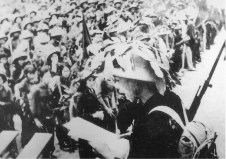 Tự vệ Đường sắt mít tinh hưởng ứng lời kêu gọi của Hồ Chủ tịch "Không có gì quý hơn Độc lập Tự do", quyết tâm đánh thắng giặc Mỹ trên mặt trận giao thông vận tải năm 1965.