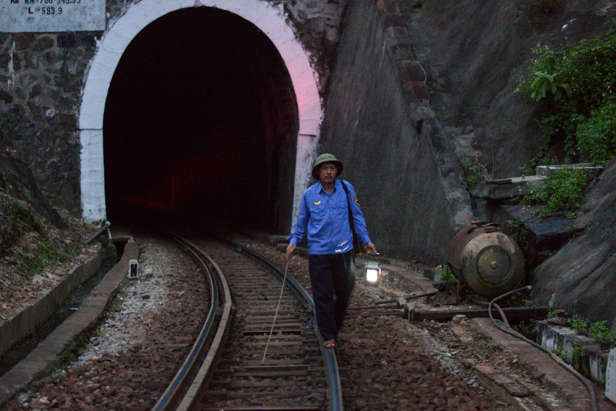 Tay trái cầm đèn pin, vai lủng lẳng túi đồ nghề, ông Định bắt đầu phăm phăm bước đi trên thanh ray nhỏ không đủ đặt trọn bàn chân người. Chỉ một quãng, cửa hầm số 12 đã hiện ra, sâu hun hút. Từ phía ngoài nhìn vào chỉ thấy bên trong đặc quánh bóng tối. (Ảnh: Minh Sơn/Vietnam+)