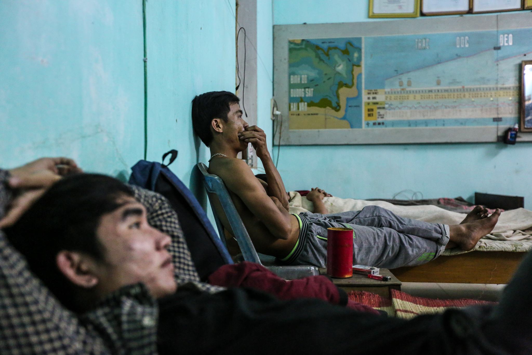 Những cán bộ công nhân trẻ lại trầm lắng hơn. Họ nằm dài ngồi xem thời sự để nắm bắt được những gì xảy ra ở ngoài cái con đèo heo hút chỉ có cây và gió. (Ảnh: Minh Sơn/Vietnam+)