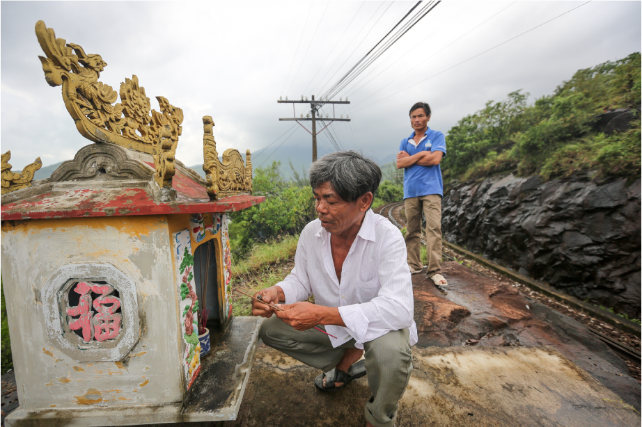 Ông Mạng bước thấp bước cao leo lên khu miếu thờ được dựng ngay nơi tàu Thống Nhất năm nào bị đổ. Chỉ tay vào triền đá đen trơn tuột rêu phía dưới, ông kể: “Lúc ấy, ưu tiên hàng đầu của chúng tôi là cứu những người còn sống, đưa họ ra khỏi đống đổ nát.”