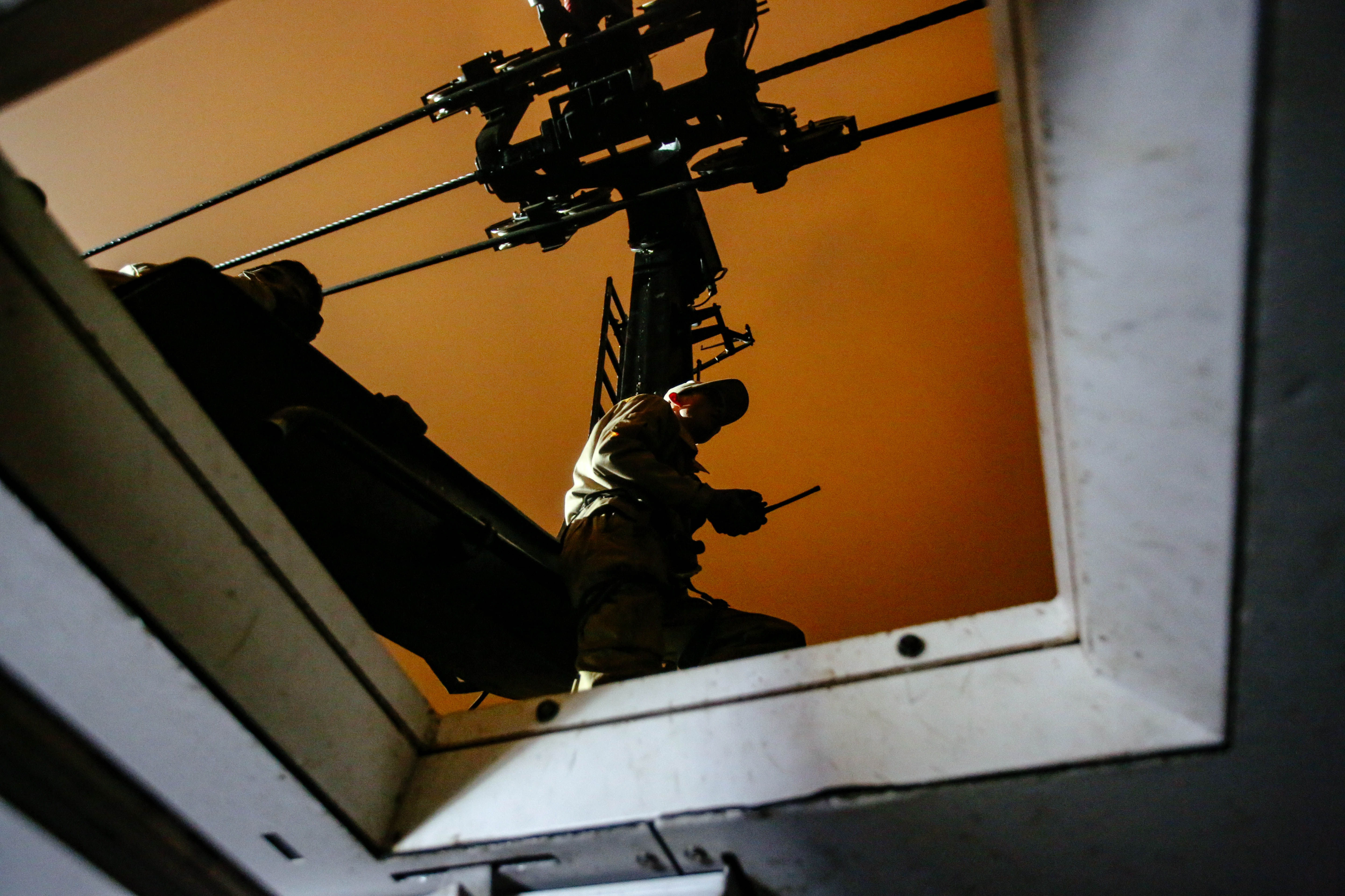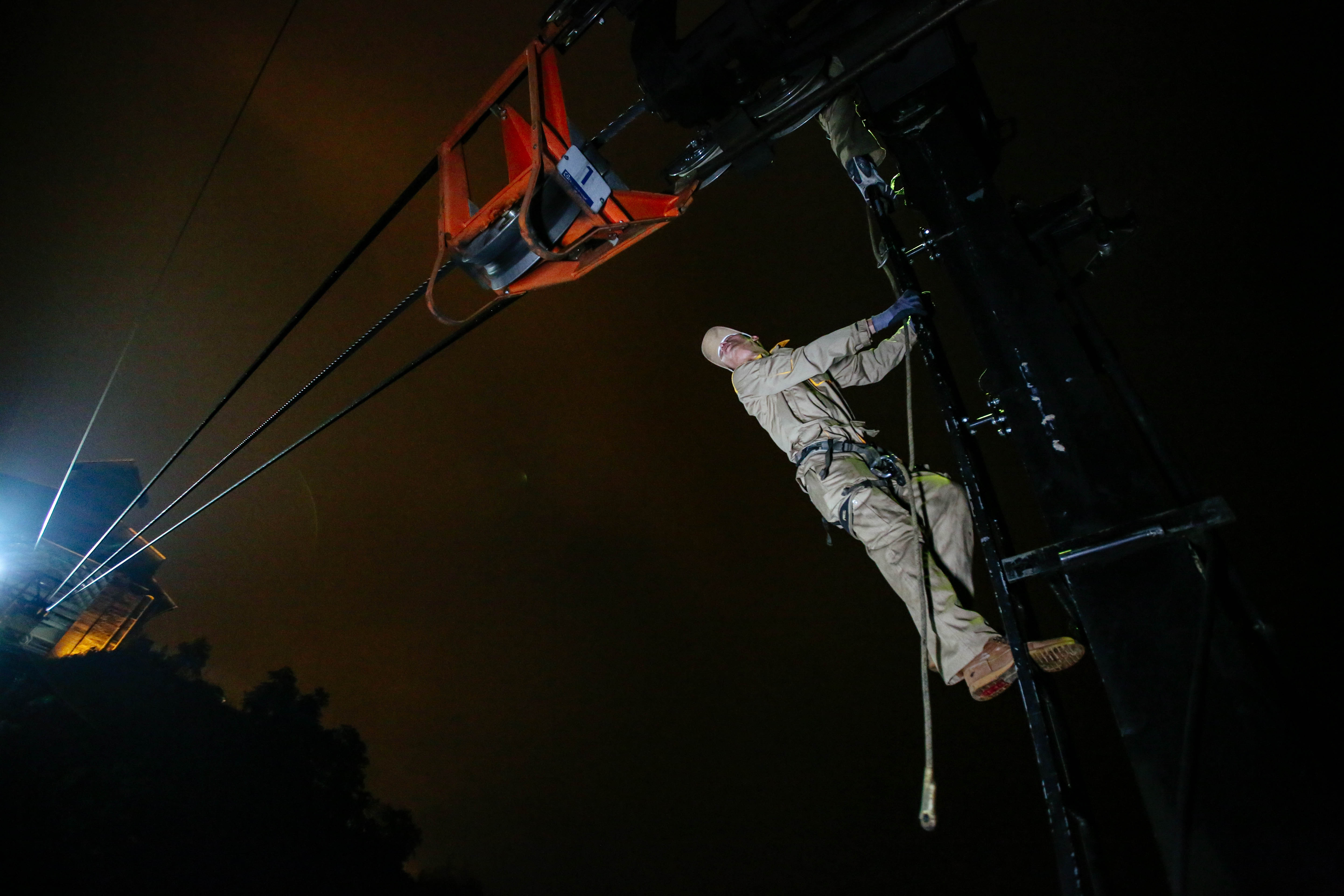 Đội bảo dưỡng phải treo mình trên đỉnh sợi cáp hàng tiếng đồng hồ để kiểm tra lại hệ thống ròng rọc và dây cáp.