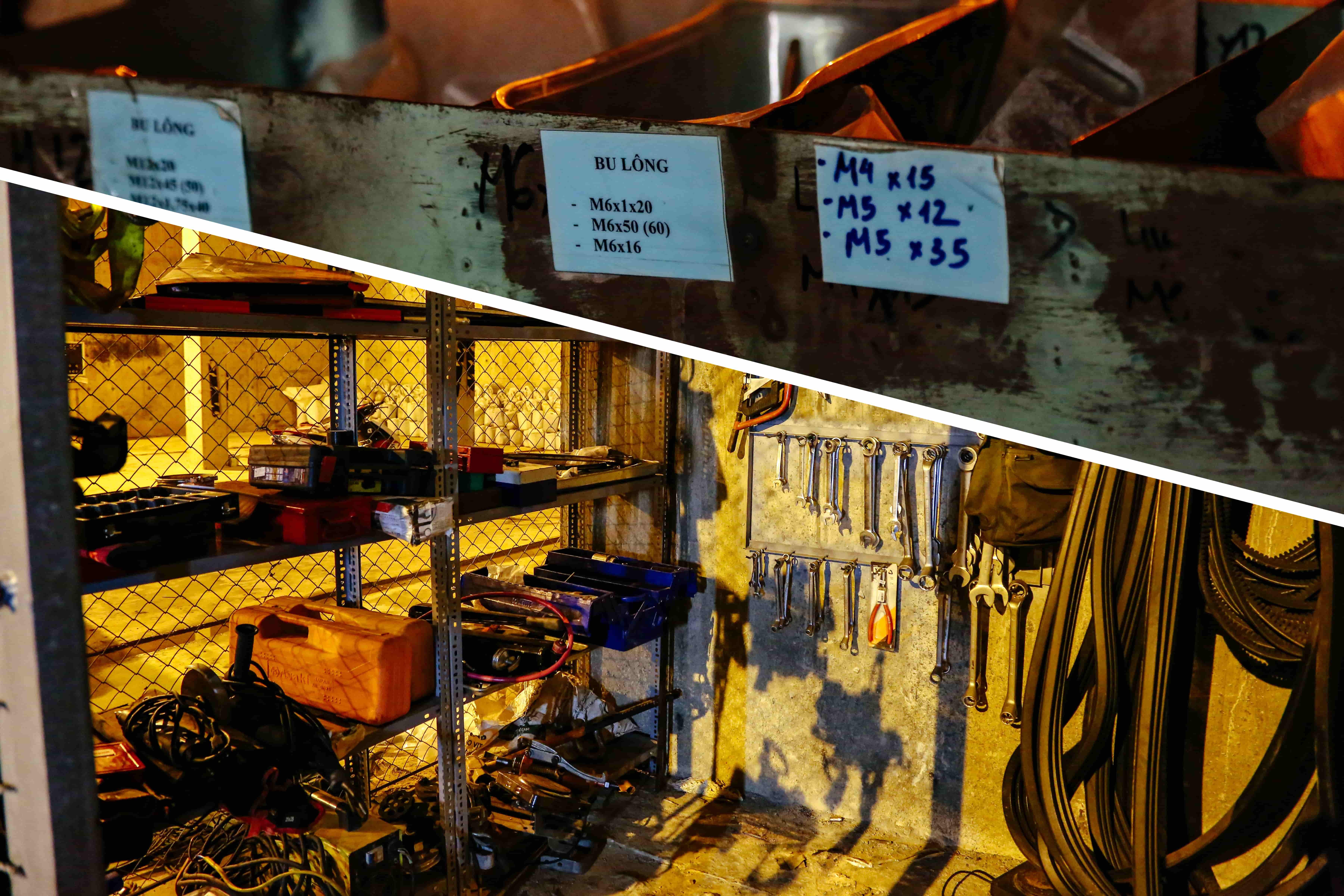 Kho dụng cụ của tổ bảo dưỡng được đặt gọn ghẽ ở một góc trong nhà khu tầng hầng của nhà ga đi cáp treo Fansipan.