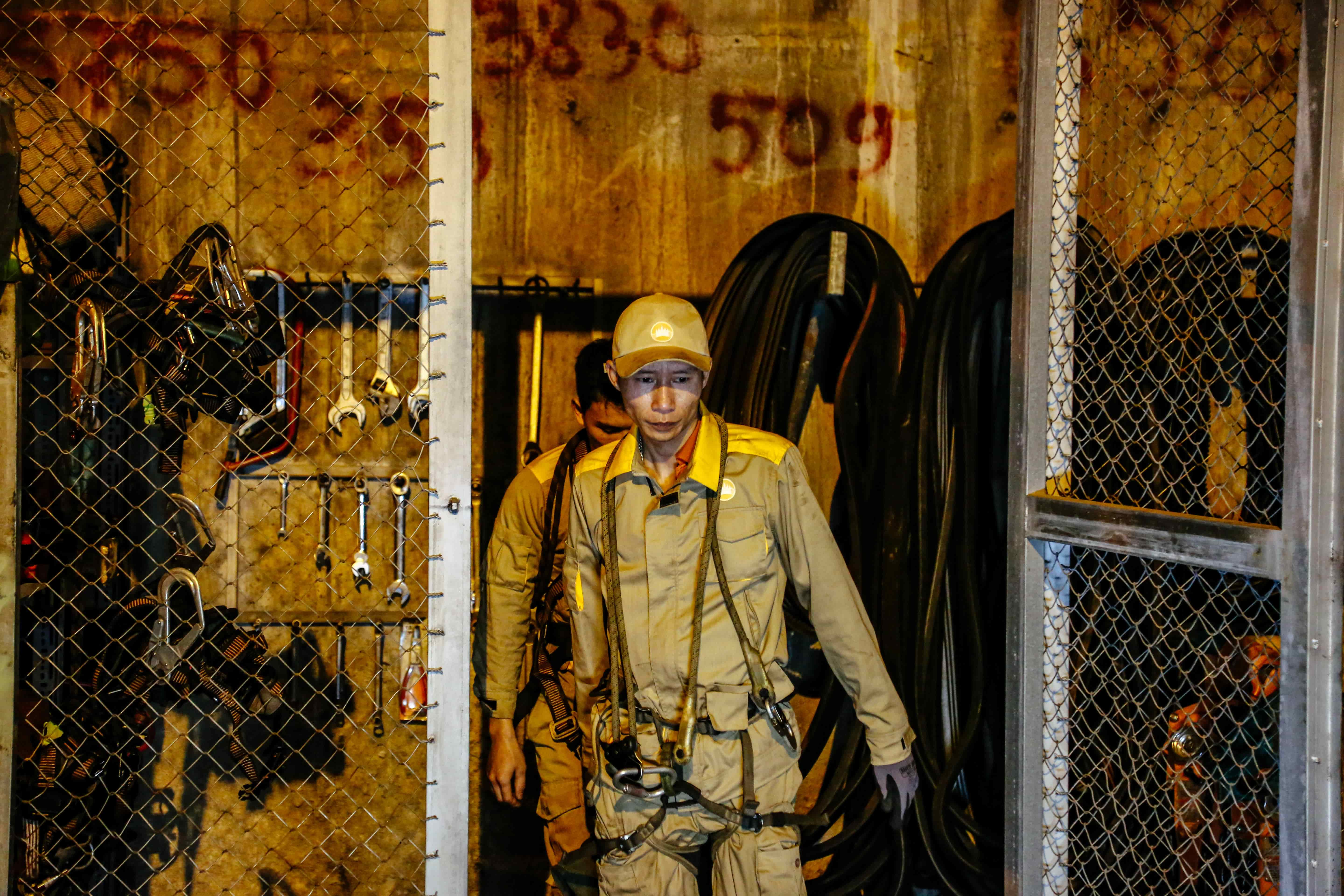 20 giờ, nền nhiệt độ xuống thấp chỉ khoảng 11-12 độ C, nhưng anh Cường vẫn toát mồ hôi vì phải liên tục lau buli và dây cáp đối trọng. "Công việc chính của tụi mình là vệ sinh hệ thống theo lịch. Chủ yếu kiểm tra độ an toàn, sự ổn định của buli. Trong buli có những vòng bi chạy, sau một thời gian sẽ bị rã ra. Mình phải kiểm tra lại để tháo dỡ và thay thế."