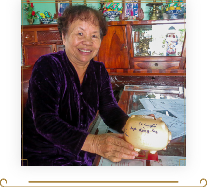 - Tích cực đóng góp các loại quỹ do các cấp phát động như : Quỹ khuyến học, quỹ Đền ơn - đáp nghĩa, Vì người nghèo, Quốc phòng - an ninh, xây dựng khu phố văn hóa… tích cực đi vận động các nguồn quỹ tại địa phương luôn vượt chỉ tiêu giao. - Thành lập Quỹ “Khuyến học, khuyến tài” bằng cách hàng ngày đi thu gom giấy vụn, ve chai. Đến từng gia đình có hoàn cảnh khó khăn, gia đình có người khuyết tật để động viên, thăm hỏi và tặng mỗi người già, khuyết tật mỗi năm tặng từ 8 đến 10 triệu đồng, số tiền được trích từ lương hưu và từ thu nhập khác của bản thân.