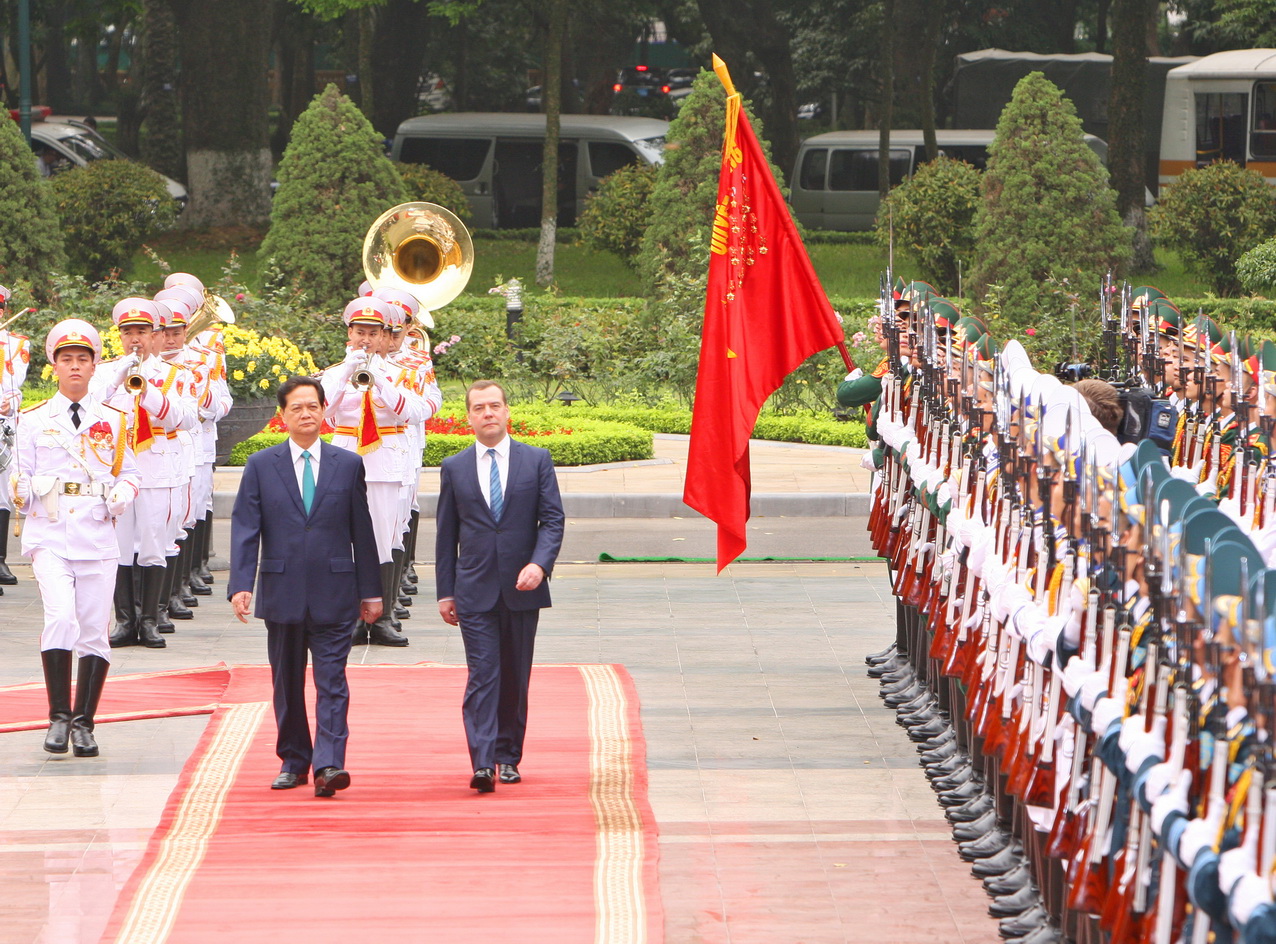 Thủ tướng Nguyễn Tấn Dũng và Thủ tướng Nga Dmitry Medvedev duyệt đội danh dự Quân đội Nhân dân Việt Nam trong lễ đón chính thức ngày 6/4/2015. (Ảnh: Thống Nhất/TTXVN)