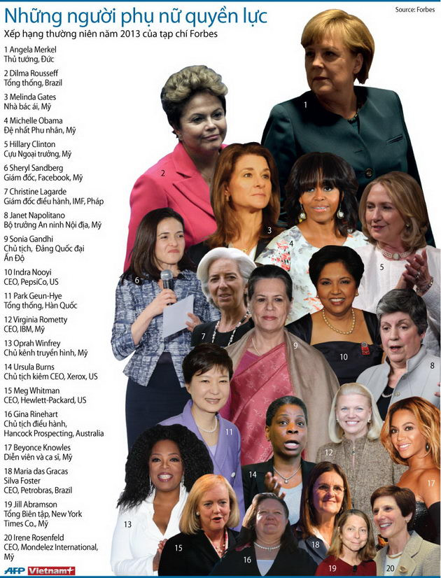 Theo bảng xếp hạng thường niên những người phụ nữ quyền lực nhất thế giới do tạp chí Forbes bình chọn được công bố ngày 23/5, nữ Thủ tướng Đức Angela Merkel giữ vị trí số một.