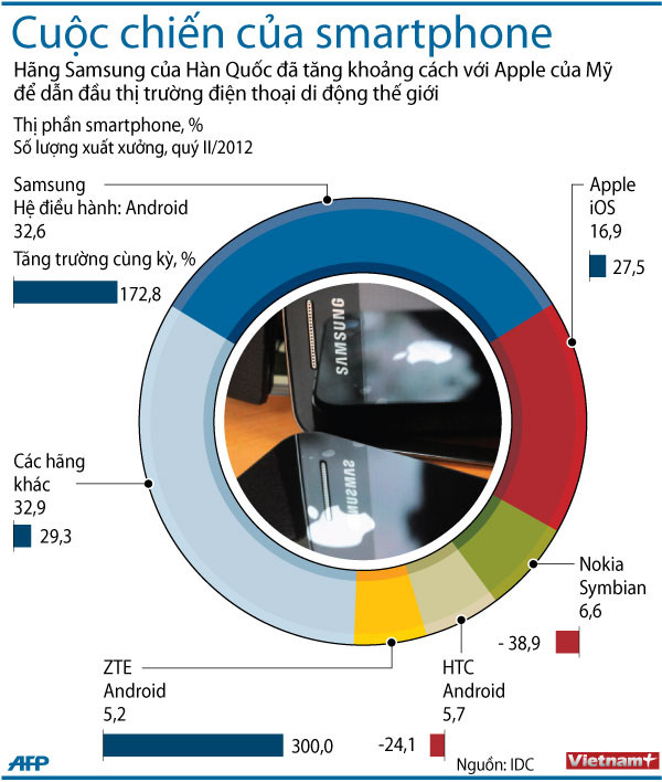 Một nghiên cứu của IDC cho thấy Samsung đã xuất bán 50,2 triệu smartphonetrên toàn thế giới trong thời gian từ tháng 4 đến tháng 6, trong khi Apple chỉbán được 26 triệu iPhone. IDC nóiSamsung đang nắm 32,6% thị phần so với 16,9% của Apple.