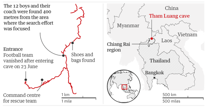 Thống đốc tỉnh Chiang Rai, Narongsak Osottanakorn, cho biết trước đó nhóm thiếu niên đã được tìm thấy trong hang động Tham Luang Nang Non dài 9,6 km, trên biên giới với Lào và Myanmar, "tất cả đều có dấu hiệu của sự sống."