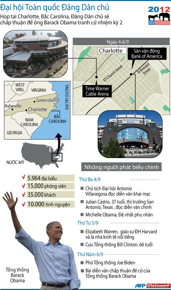 Bốn ngày sau đại hội của đảng Cộng hòa, ngày 4/9, Đại hội toàn quốc của đảng Dânchủ đã khai mạc tại trung tâm thể thao Time Warner Cable Arena của thành phốCharlotte, bang Bắc Carolina.