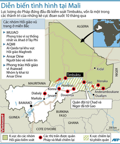 Cùng ngày nguồn tin quân đội và Chính phủ Mali cho biết liên quânPháp-Mali đã giành quyền kiểm soát hoàn toàn thành phố Timbuktu, thành trì củacác tay súng Hồi giáo cực đoan chiếm đóng miền Bắc Mali từ tháng 4/2012.