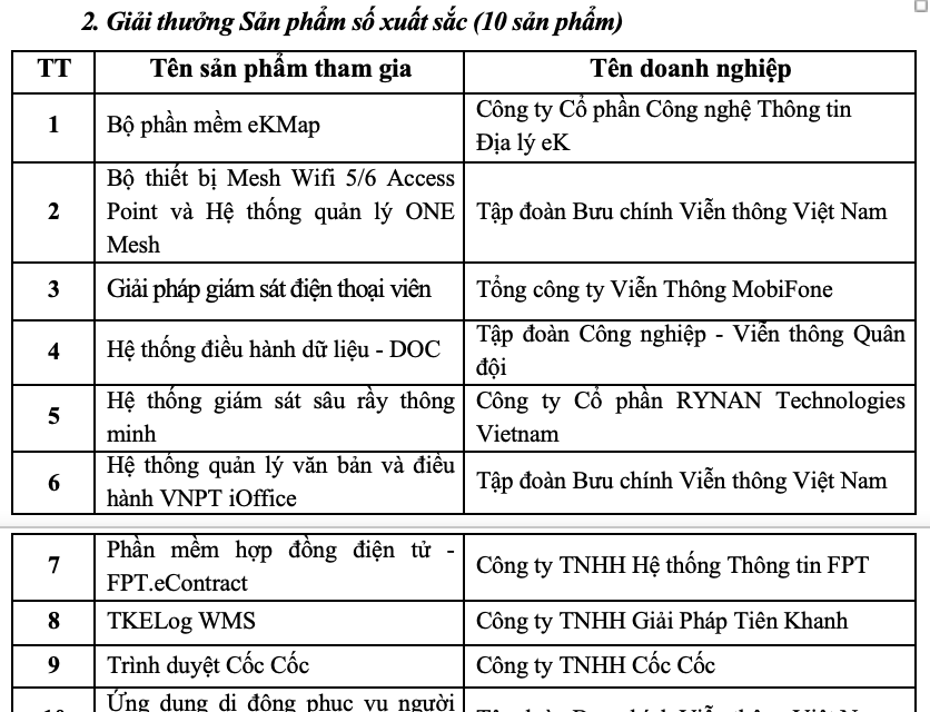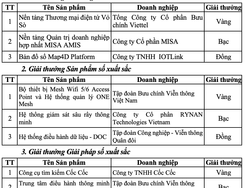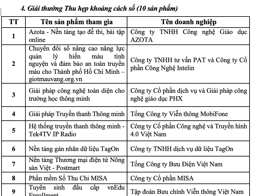 Bốn sản phẩm gồm Phần mềm sổ thu chi MISA; Nền tảng ứng dụng điện toán đám mây cho camera VNG Cloud; Hệ thống điều hành dữ liệu DOC Viettel; Bản đồ số Map4D của IOTLink nhận giải Đồng.