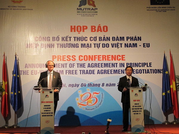 Sau phiên đàm phán lần thứ 14 diễn ra trong các ngày 13-17/7, Bộ trưởng Bộ Công Thương Việt Nam Vũ Huy Hoàng đã có buổi điện đàm với Cao ủy Thương mại EU, Cecilia Malmstrom và thống nhất kết thúc cơ bản đàm phán Hiệp định thương mại tự do giữa Việt Nam và Liên minh châu Âu (EVFTA).