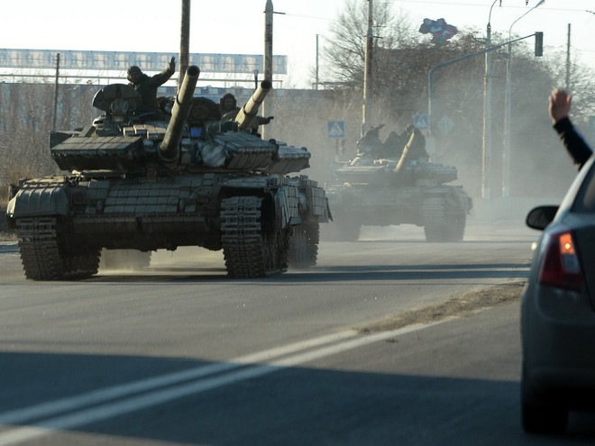 Lực lượng ly khai Ukraine trên xe quân sự hạng nặng tại thành phố Lugansk ngày 21/2. (Nguồn: AFP/TTXVN)
